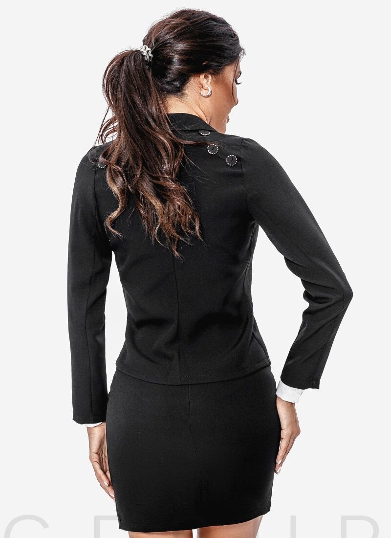 Classic three-piece suit: a jacket with a turn-down collar, lapels, long sleeves, a beveled button line, straight-cut trousers with a high fit and a hidden zipper on the side, a short A-line skirt with a hidden zipper on the back. ..