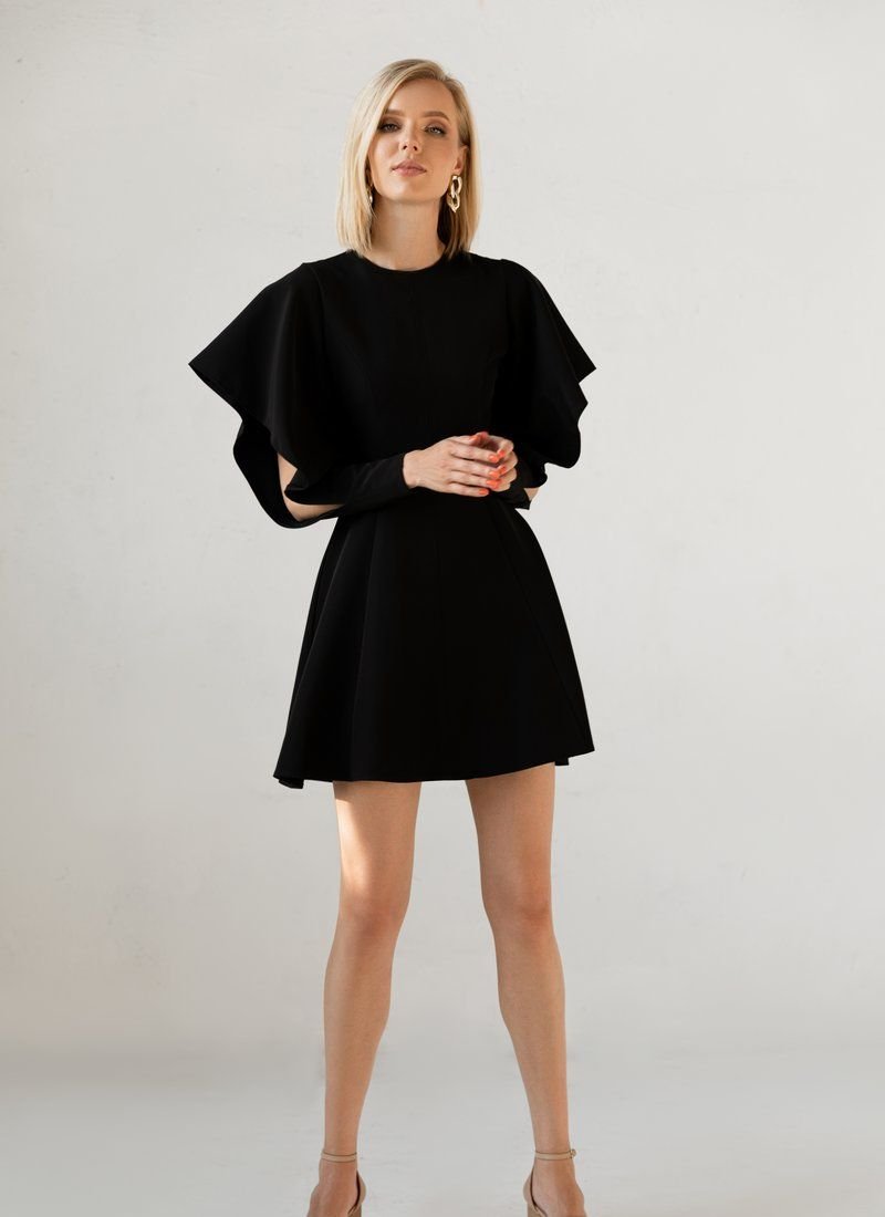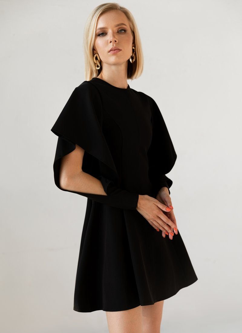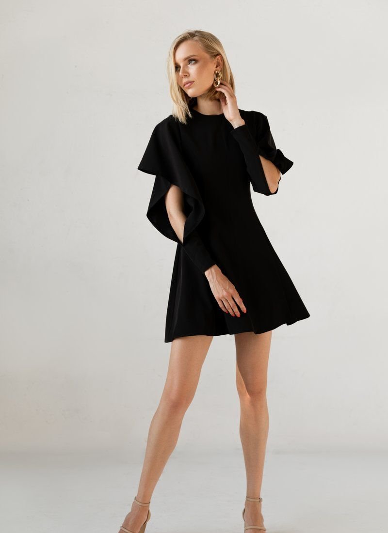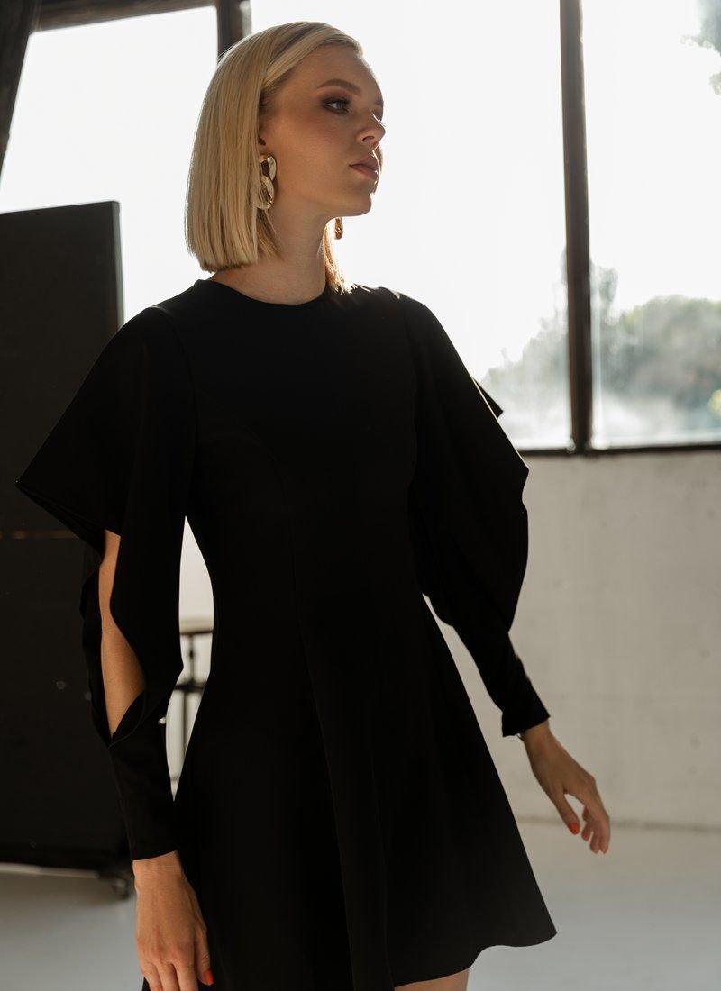 Black mini dress with a round neck. There is a small zipper on the back, long open sleeves with flounces from the shoulder and zippers on the cuffs, which will become an accent in your image.