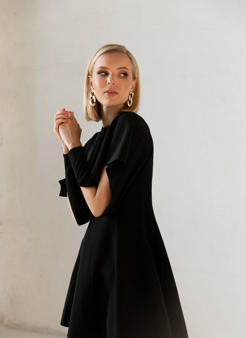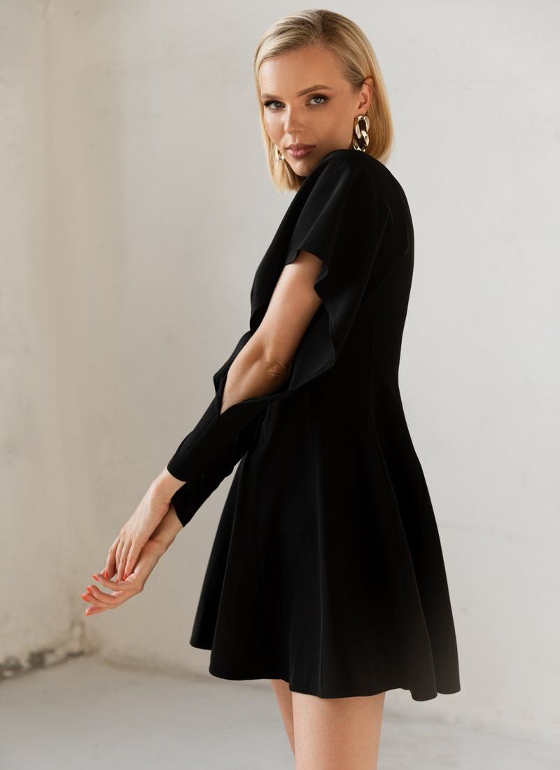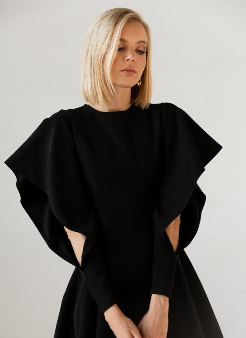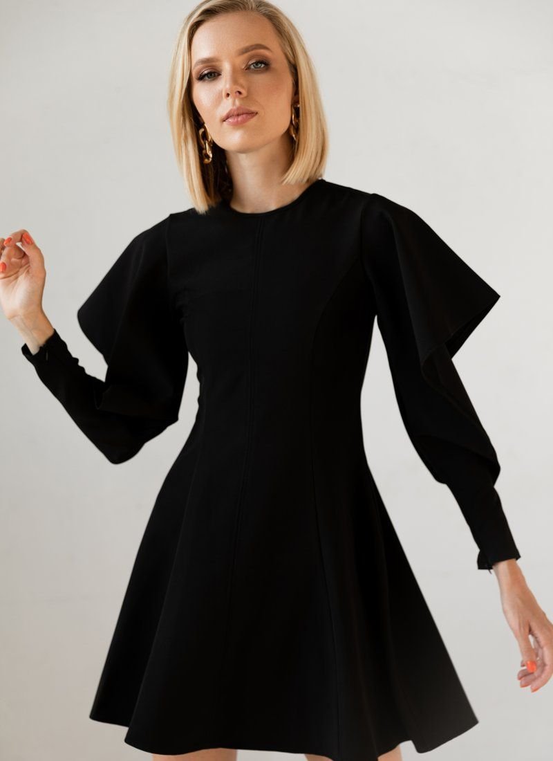 Black mini dress with a round neck. There is a small zipper on the back, long open sleeves with flounces from the shoulder and zippers on the cuffs, which will become an accent in your image.