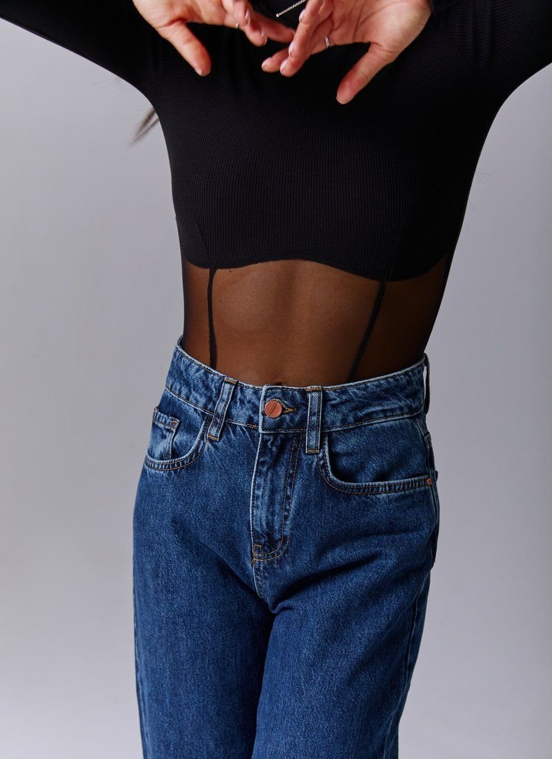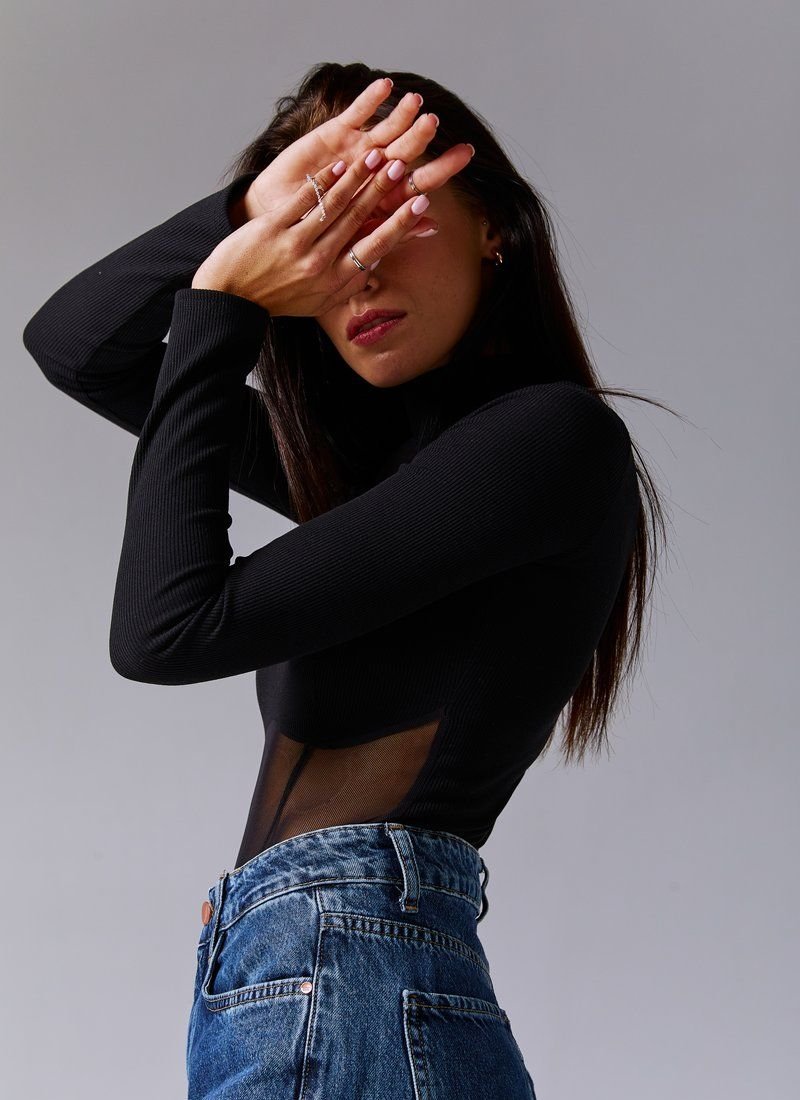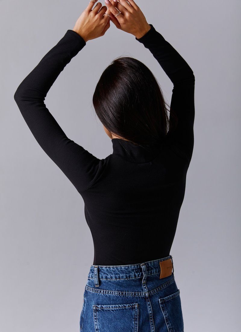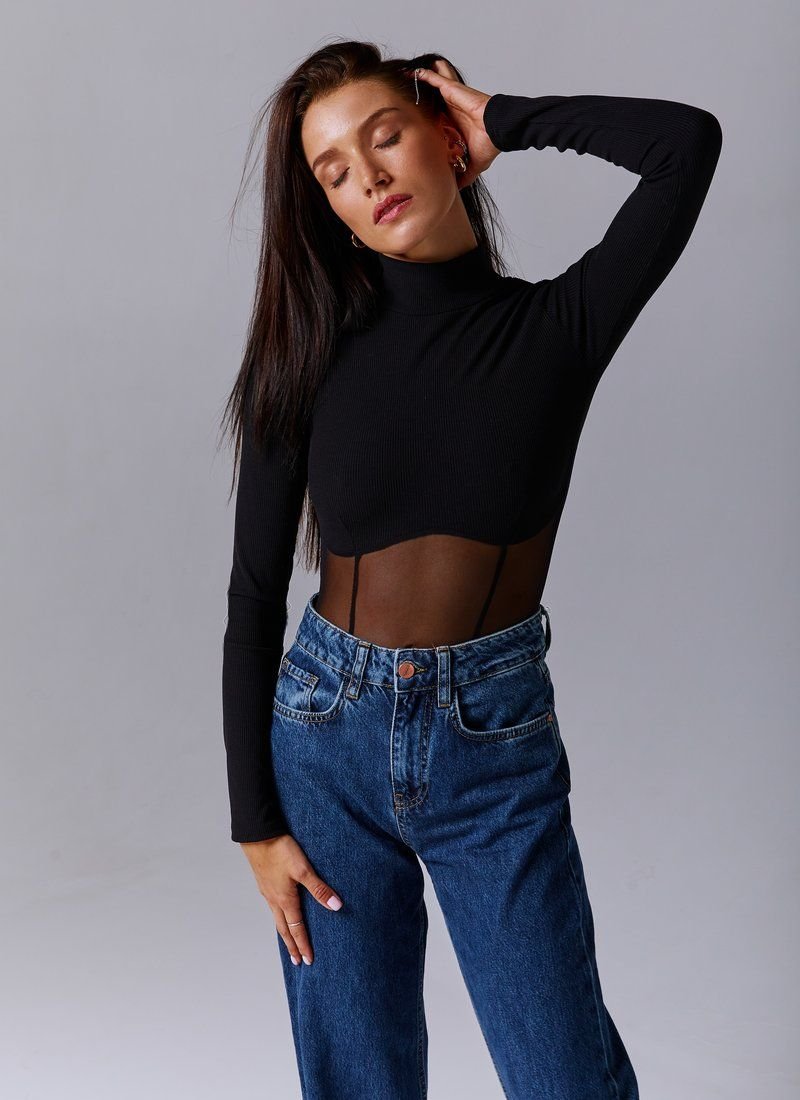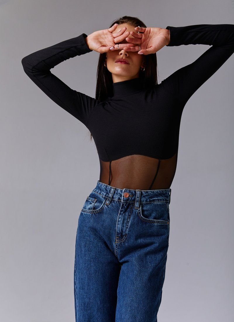 Black knitted bodysuit with long sleeves, stand-up collar, buttons on the bottom. The model is stylized with a grid, which adds a zest to the image.