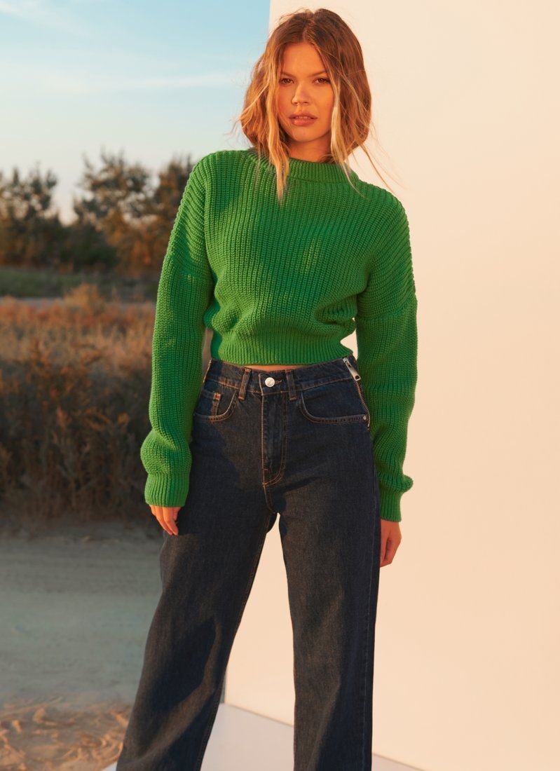 The Pantone Color Institute highlights green as one of the main colors of the year, and continues to be trending in the FW 2021/22 season. A short-cut jumper with long sleeves, a deflated shoulder line.