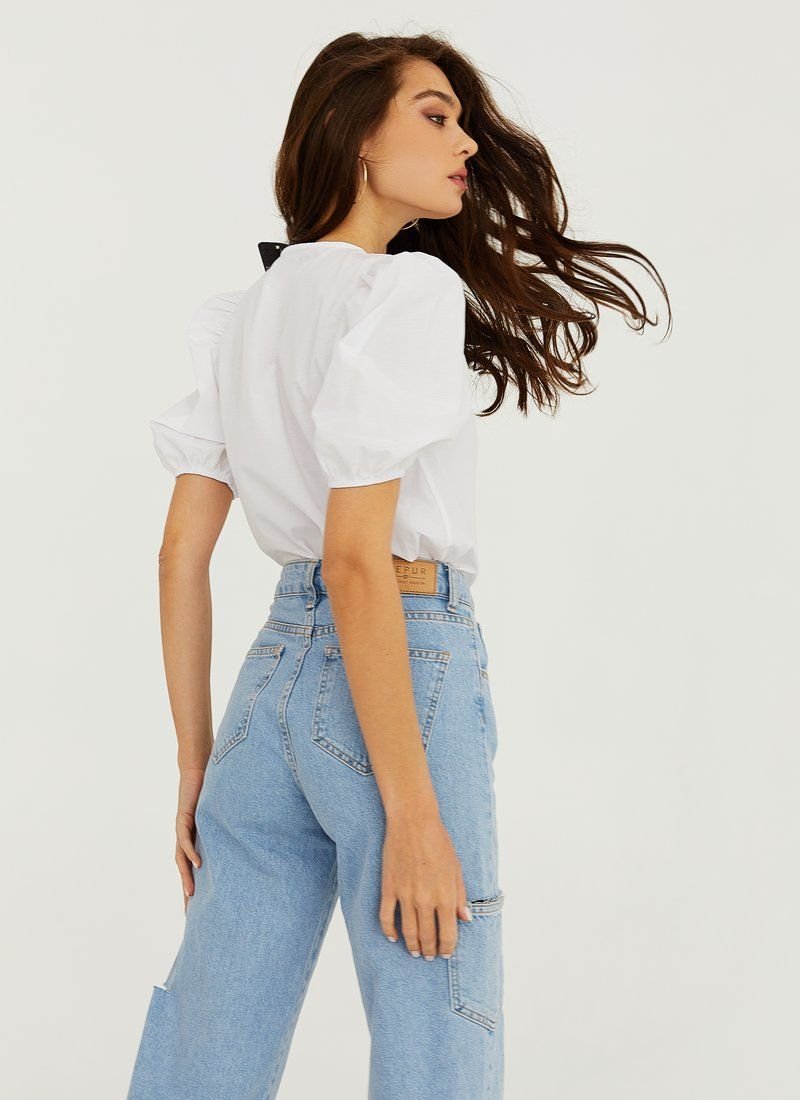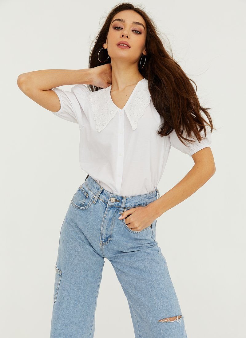 A loose white blouse looks quite informal for the office due to the accent collar. The lace detail supports the current SS'21 trend. Soft cotton material was chosen for sewing the model with short lantern sleeves.