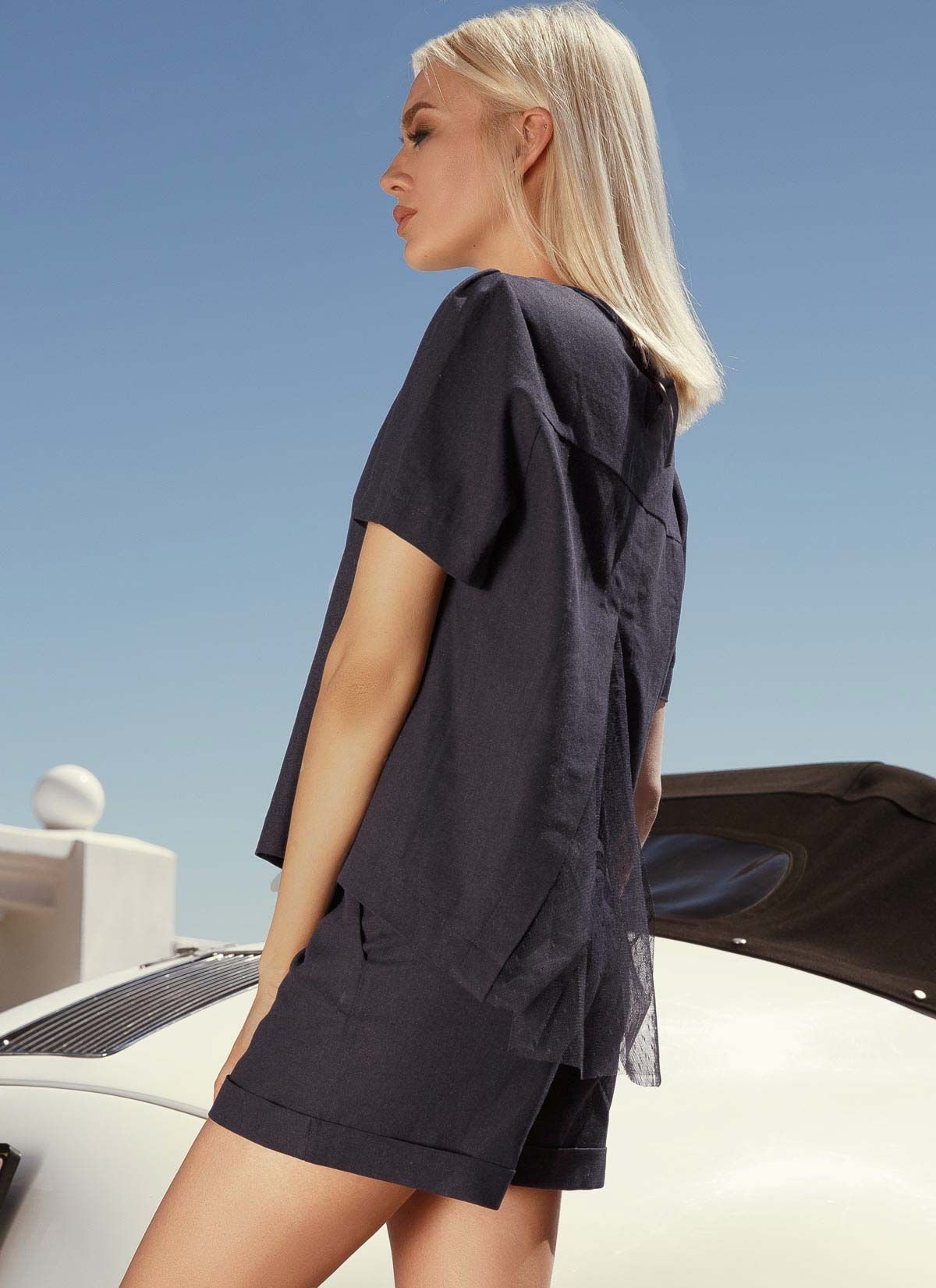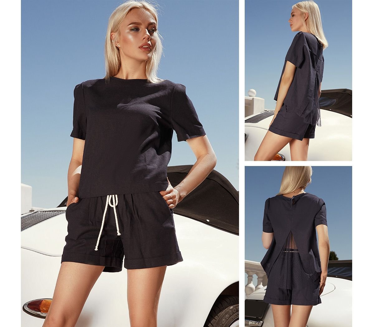 Summer suit made of linen fabric: a loose top with short sleeves, a slit with ties and a mesh insert on the back, short shorts with a fixed lapel, an elastic waistband, a removable rope strap and welt pockets. ...