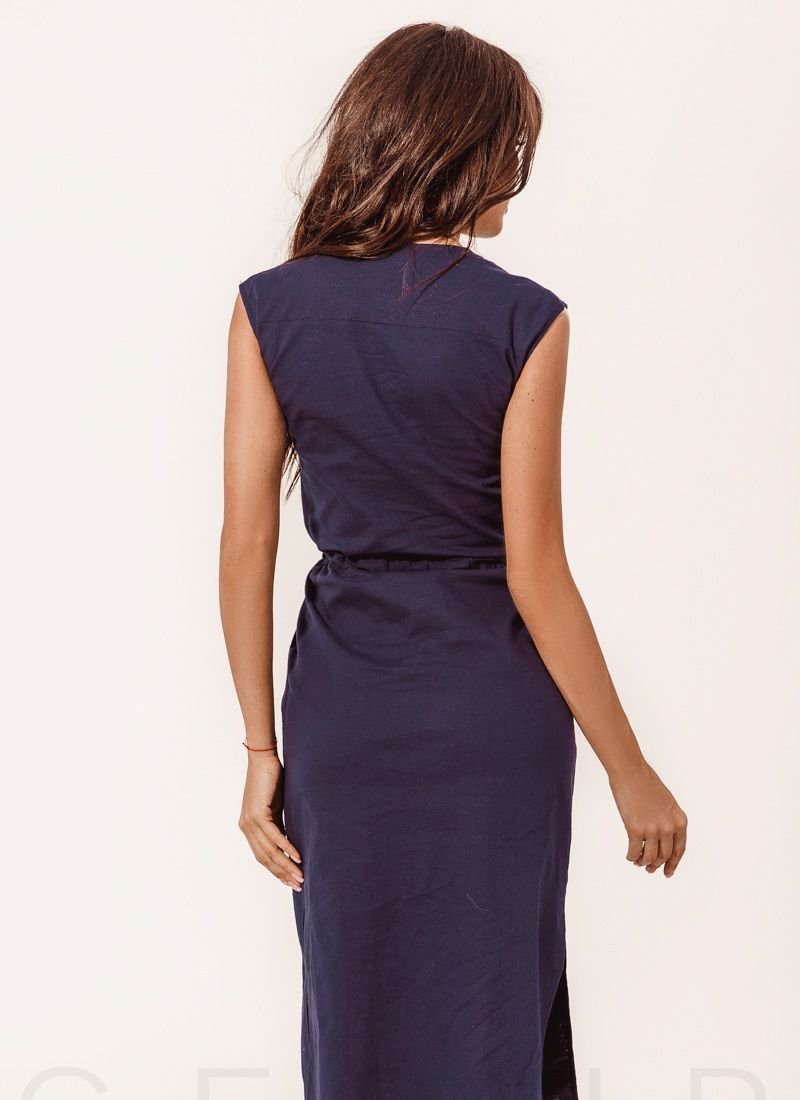 Casual dress of classic cut without sleeves, round neck, ties at the waist, rounded hem with slits on the sides and two pockets, patch with a flap on the chest and cut-off on the skirt.