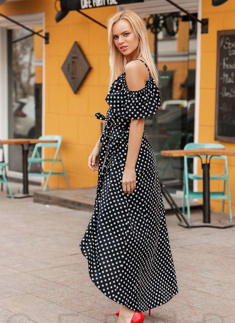 A long cotton wrap dress decorated with a trendy pea print, with a small v-neck, thin adjustable straps and ruffles with elastic inserts on the shoulders.