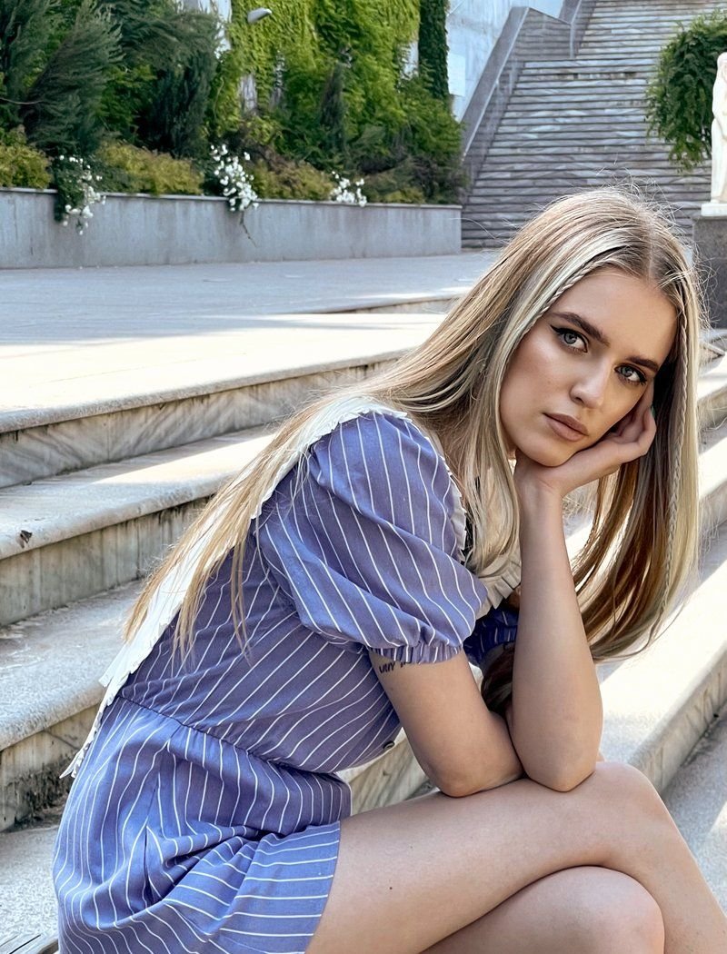 The three-dimensional retrofern is the main part of the SS21! It became a spectacular decoration of a striped summer jumpsuit from Gepur designers. The original model with a short flashlight sleeve, flared shorts and a deep cut on the back will become a favorite in your summer wardrobe. An elastic insert at the waist, two welt pockets on the sides and ties on the back make the jumpsuit as practical as possible.
