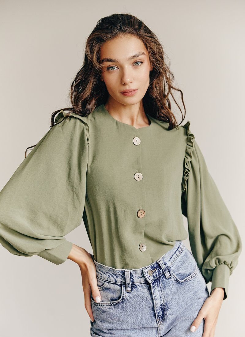 Blouse of a straight cut with a round neck on buttons stylized as wood. The long sleeve at the base is decorated with a thin neat frill, with wide cuffs. This blouse will go perfectly with both trousers and jeans.