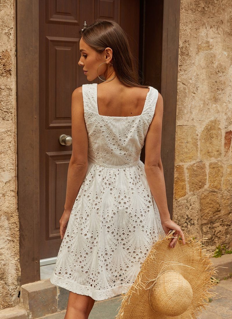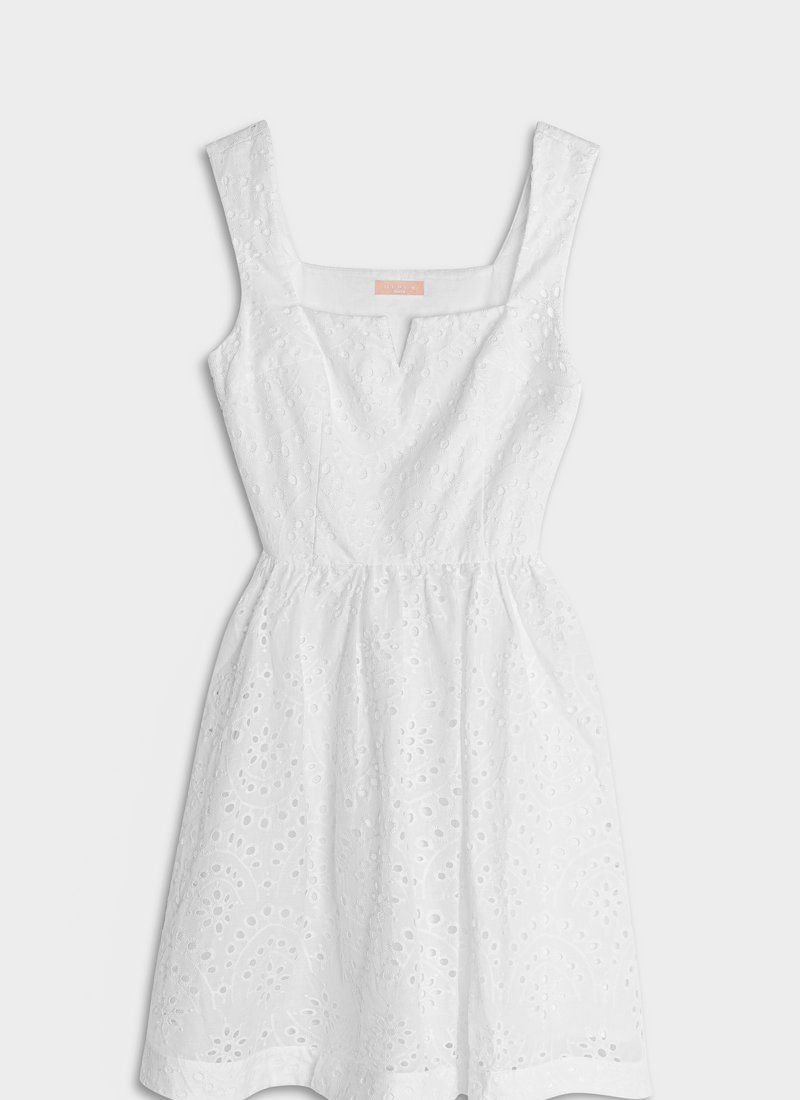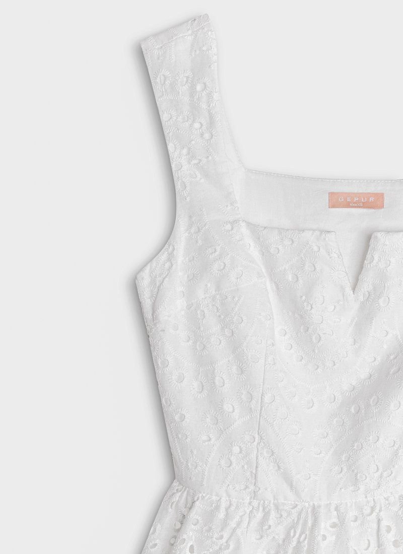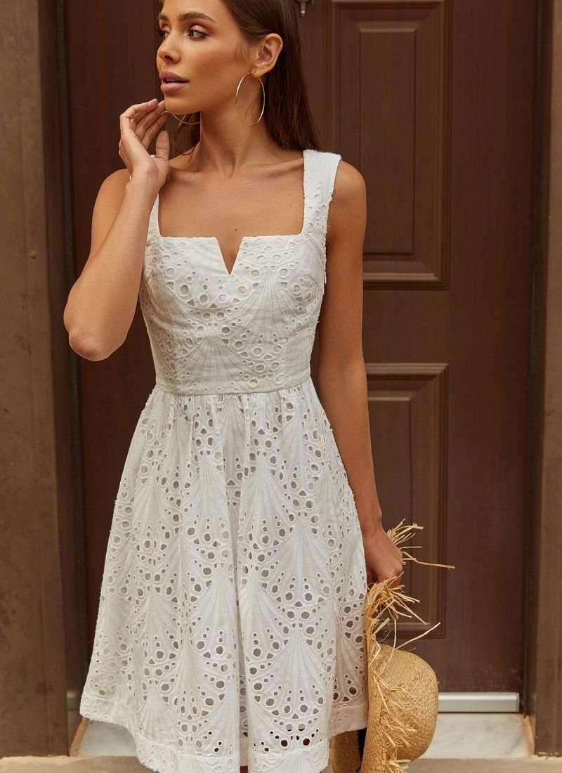 The openwork material automatically makes any thing more feminine, especially when it comes to a fitted mini dress with a curly neckline. For sewing a white model, Gepur designers chose a light stitching that allows the skin to breathe. Please note that the pattern has changed (see additional photo from 05.07).