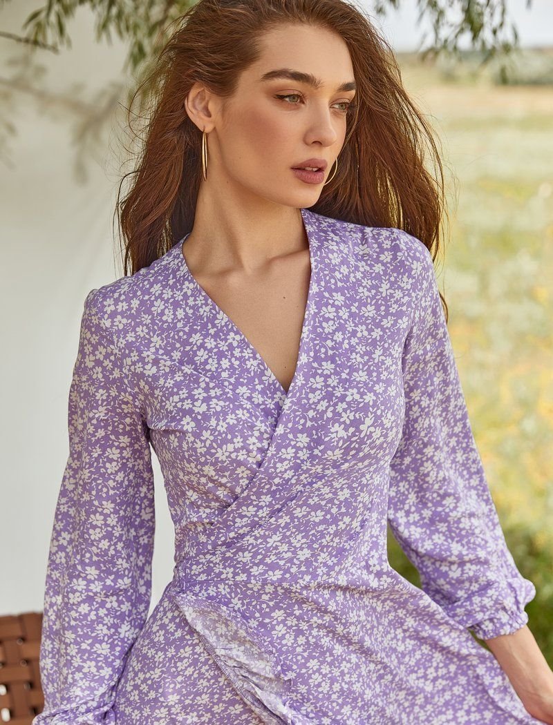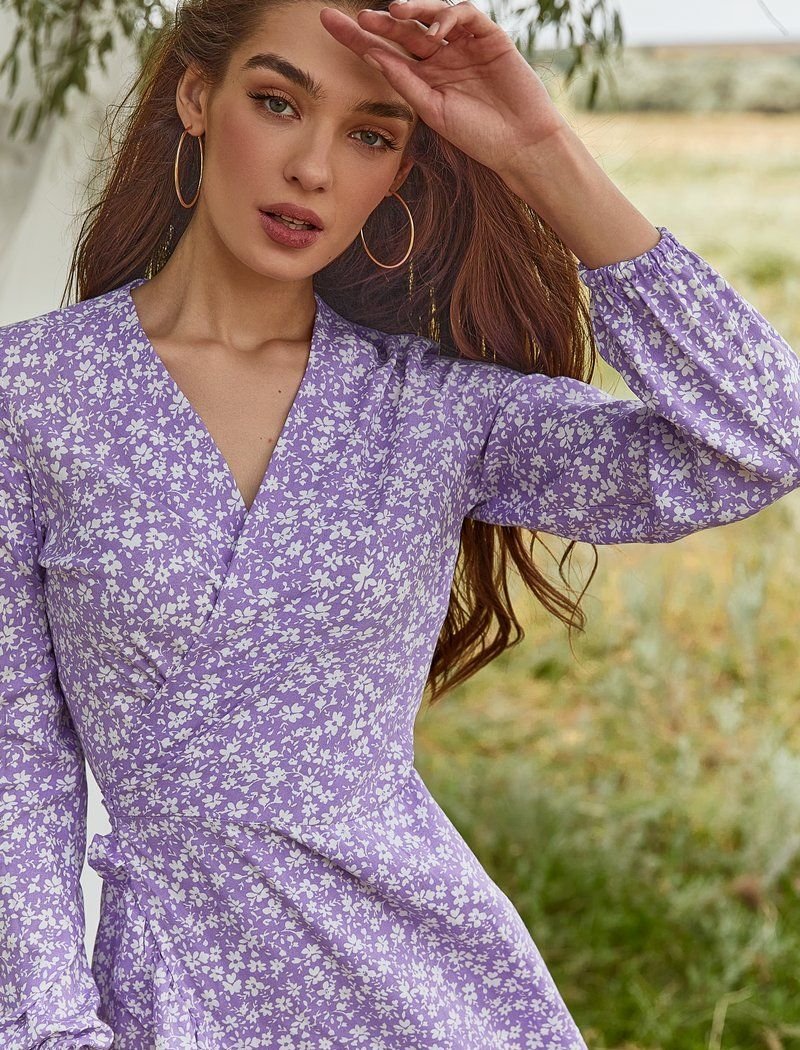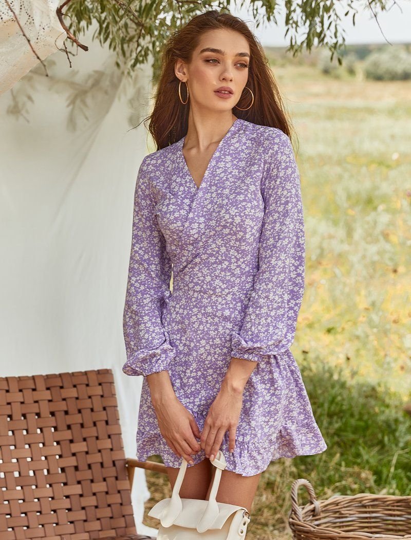 A short dress with a smell in a small flower is the best choice for the summer season! To create this model, a light cotton fabric was used. The dress has a loose 3/4 sleeve with an elastic cuff and a flared skirt decorated with a flounce at the hem.