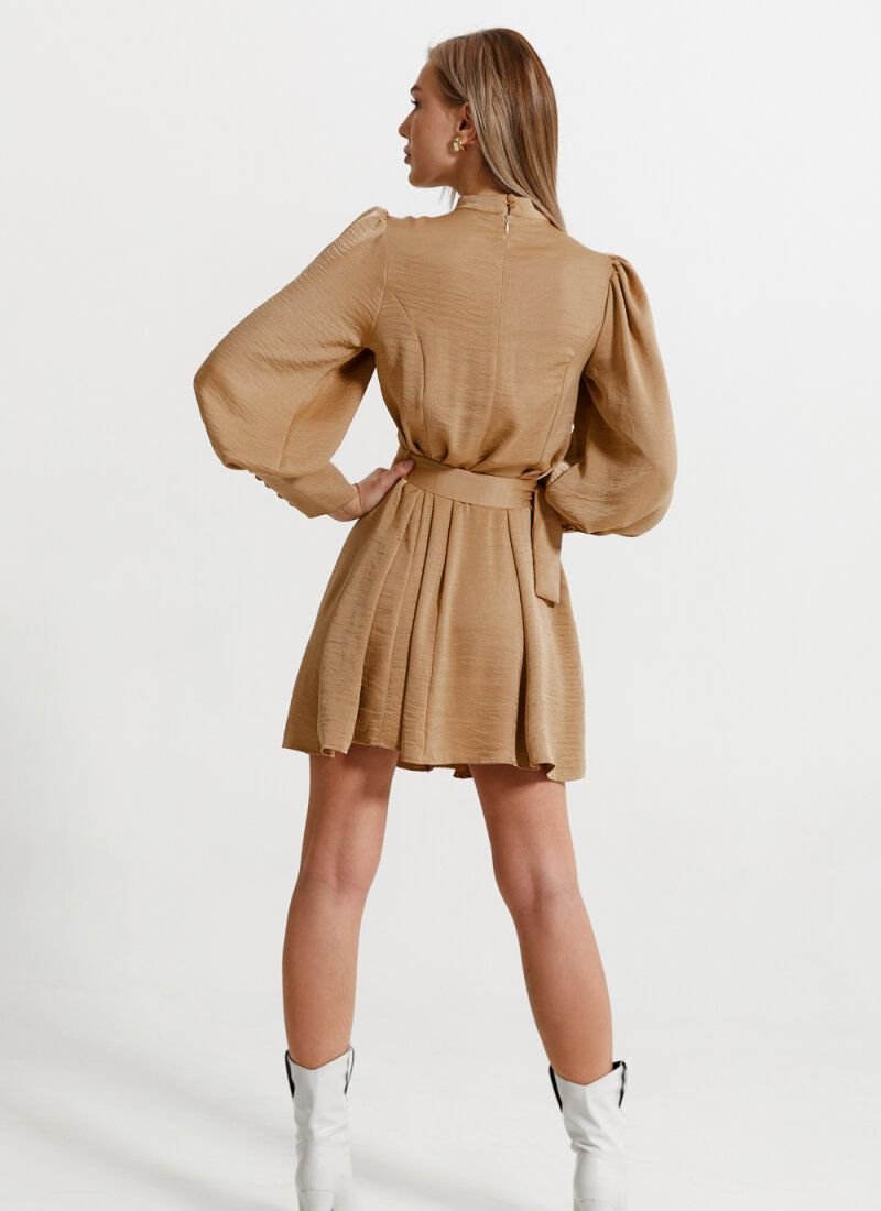 The feminine mini dress is made of a light material with a little shine. Decorative placket with buttons on the front side, puffy sleeves on the cuffs, stand-up collar give the model a Victorian style. The waistline is emphasized by a removable belt with a massive buckle.