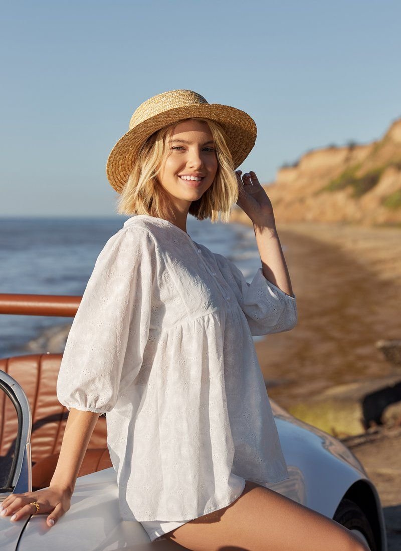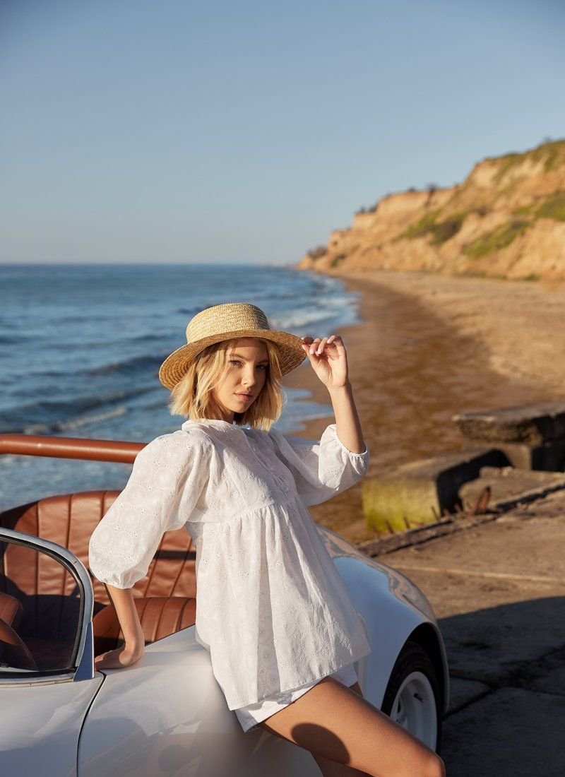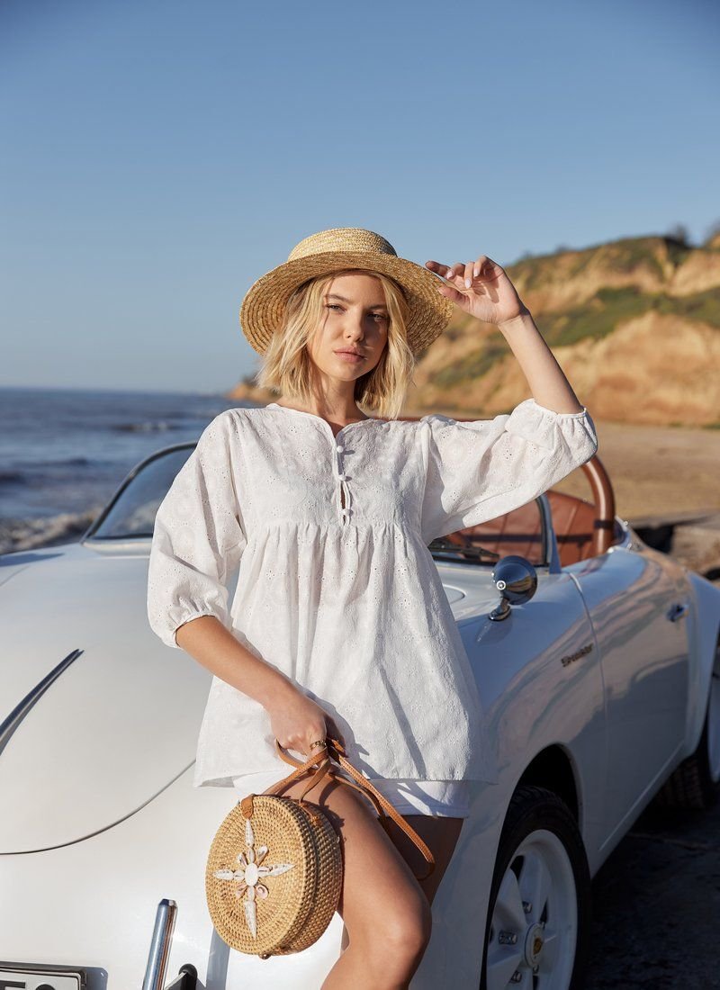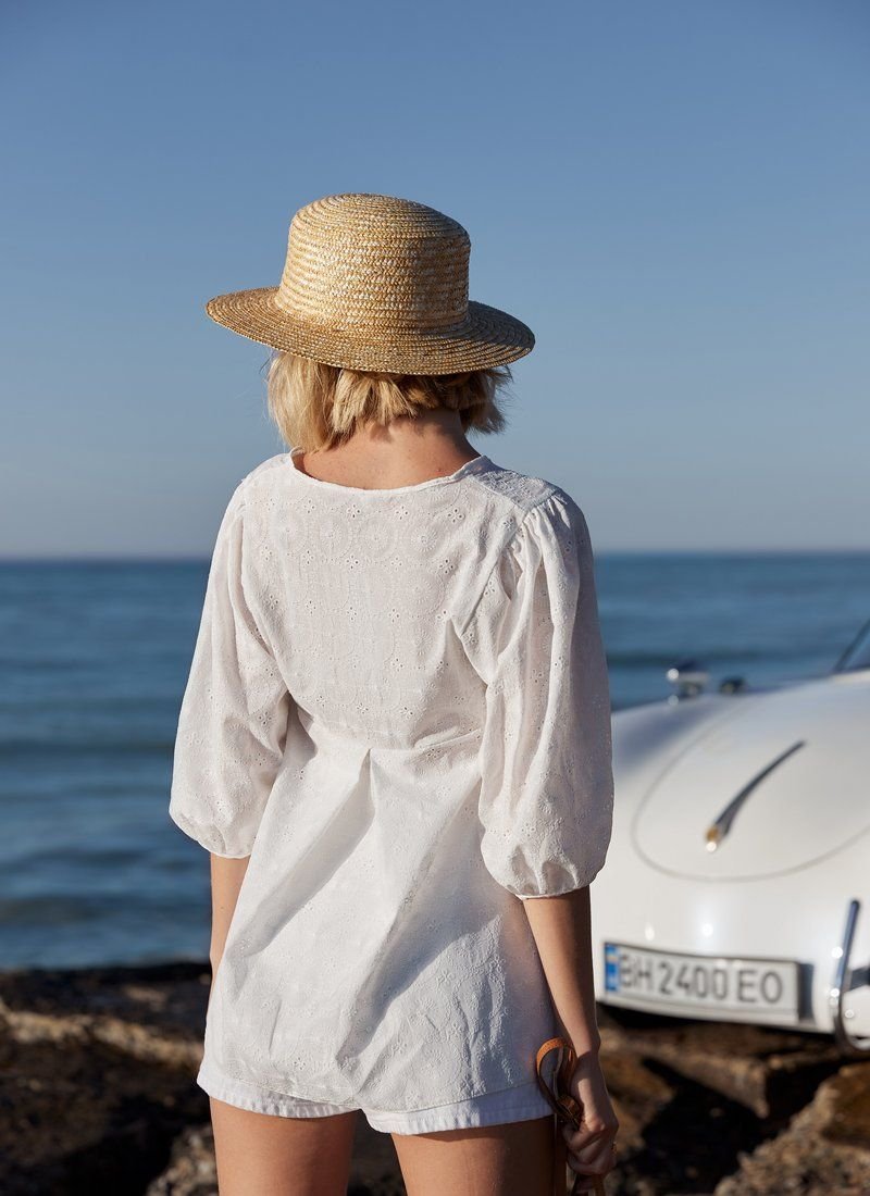 The white blouse seems to be created for feminine romantic images. To cope with this task helps the color, the cut with an inflated waist, and most importantly - the material. For sewing a blouse with 1/2-length sleeves, weightless cotton was used, which passes air and is decorated with openwork embroidery.