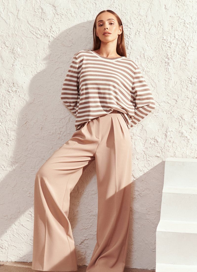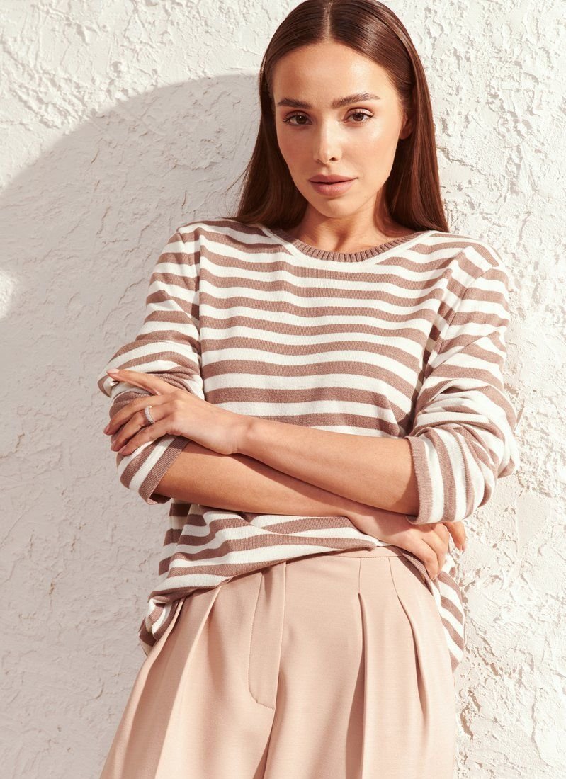 Striped jumpers - vests, remain relevant regardless of fashion trends. The beige model is made of soft knitwear. In SS'21, it can be combined with trendy wide jeans, leather or palazzo trousers. Accessories - bright bags, large earrings and chains will also help to add the spirit of modernity to the image.
