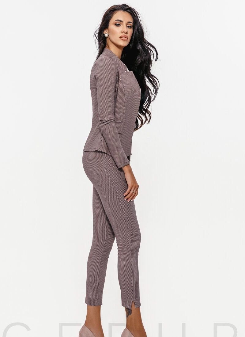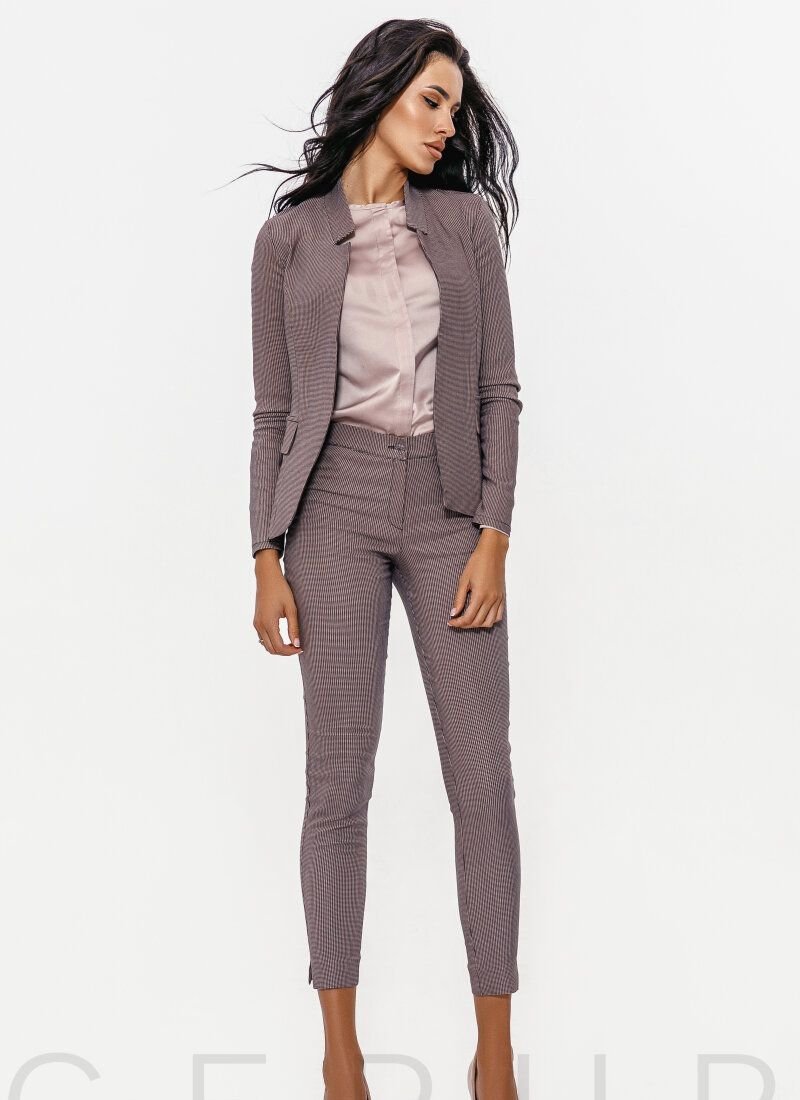 Stylish pantsuit: fitted jacket with a stand-up collar, long sleeves and flaps, trousers of medium fit with a narrow cut.