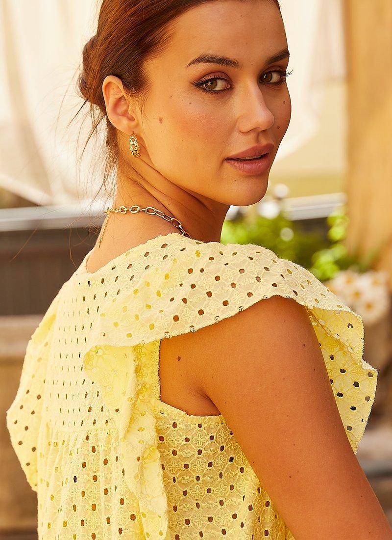 An actual summer blouse made of stitching with floral embroidery. The original flared cut of the blouse is complemented by a neat yoke and wide flounces imitating sleeves.