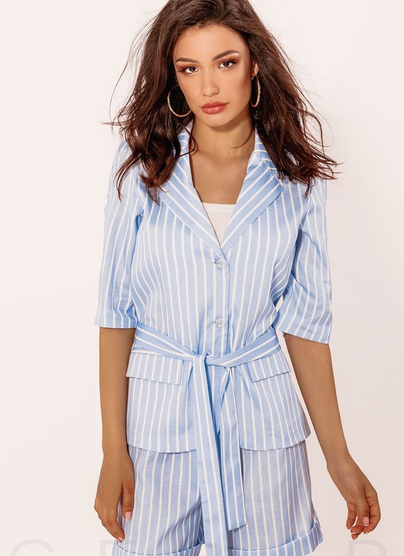 Lightweight suit in contemporary striped print complemented by solid waist: single breasted jacket with classic collar, lapels, sleeves ? and two Welt pockets with flap, shorts with a high rise, fixed lapels and two Welt pockets on the sides. ...