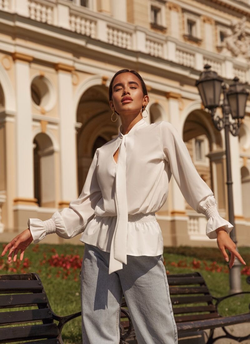 A loose-fitting blouse in casual style, made of flowing fabric. A small teardrop-shaped neckline on the chest, a short collar with ties, elastic inserts on the belt and sleeves. The blouse is complemented with stylish ruffles.