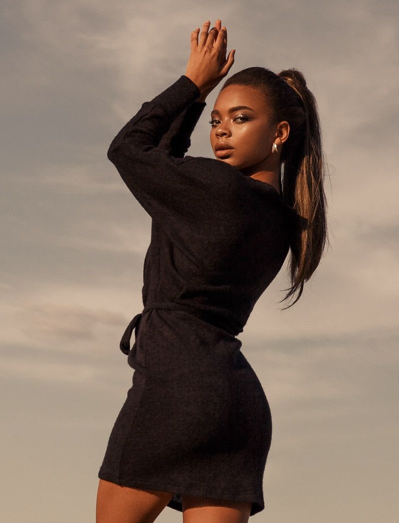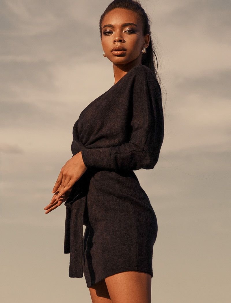 A knitted dress on the back?x with a one-piece sleeve, a deep v-neck, a cut-off waist, a tight-fitting skirt, complemented by a plain belt.