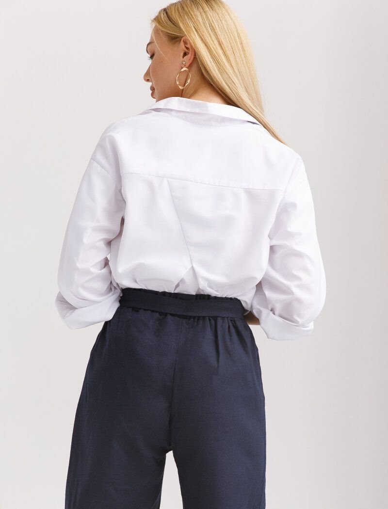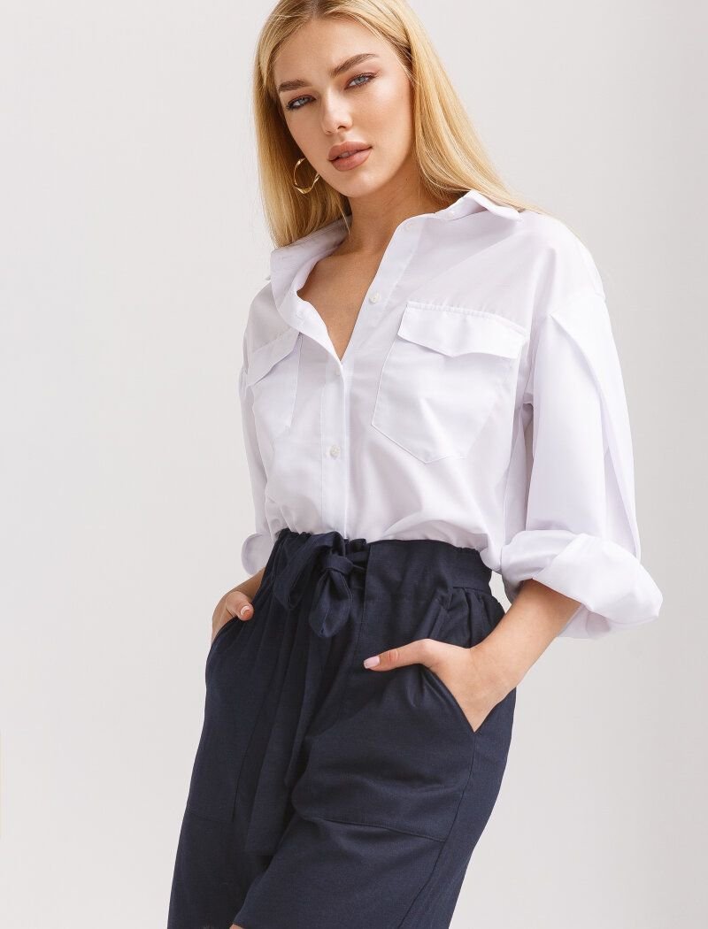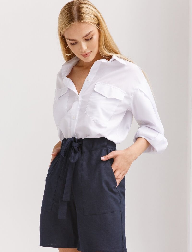Loose casual shorts made of dark blue linen fabric. Elastic waistband with wide ties. The model is complemented by fixed zips and two welt pockets.