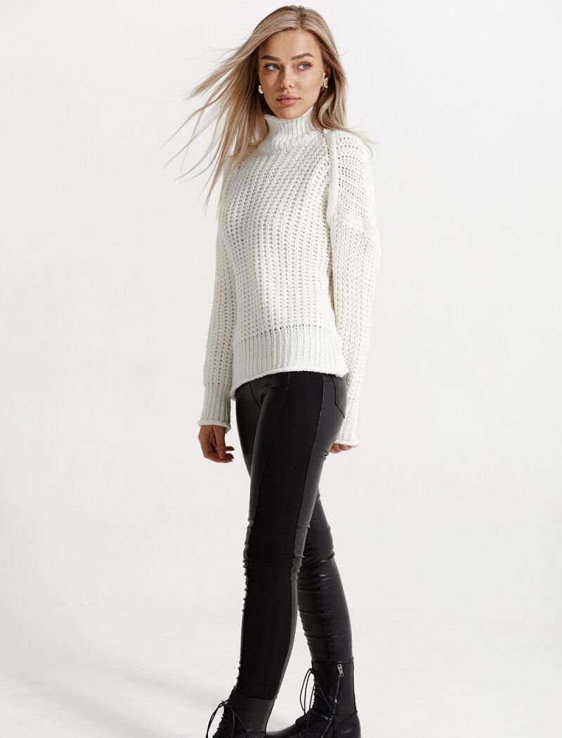 Insulated leggings made of eco-leather with a fleece inner layer: medium fit, narrow cut, wide elastic waistband, elastic knitted inserts on the sides.