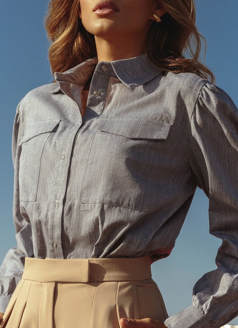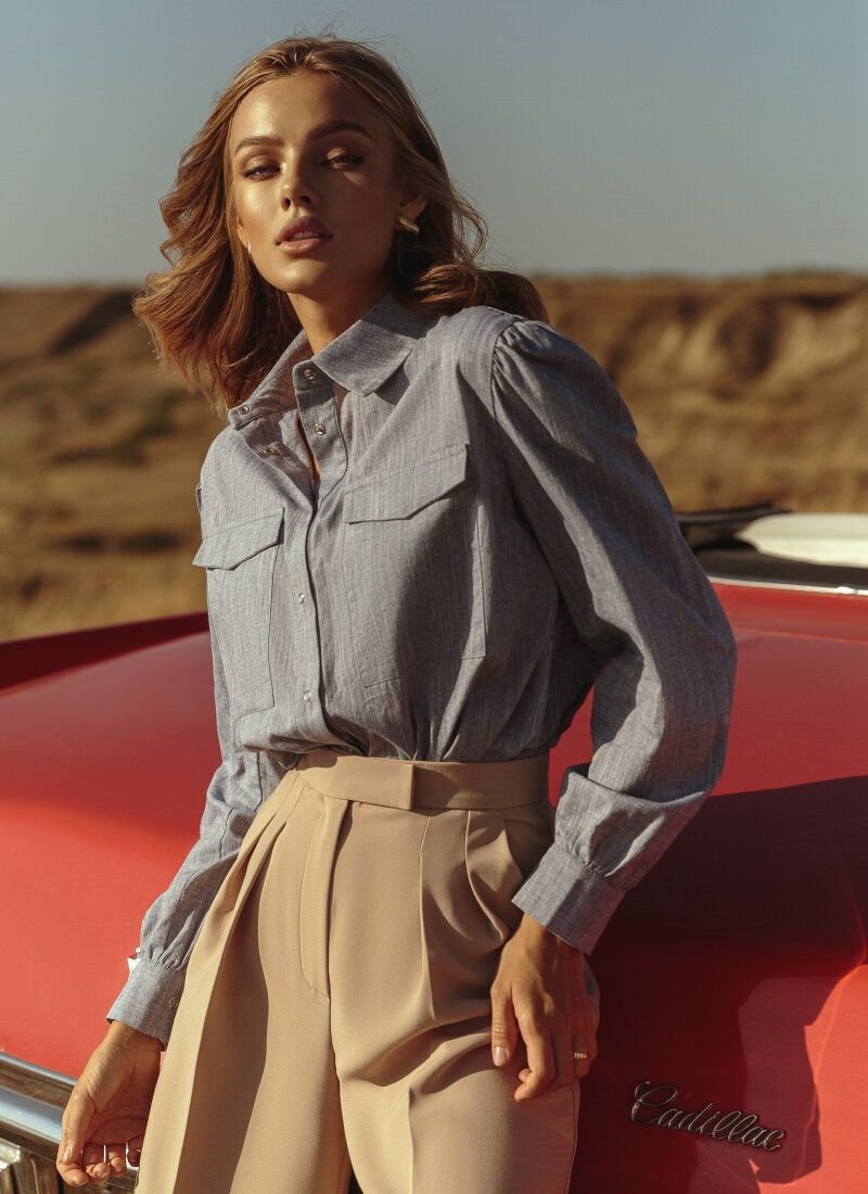 The voluminous blue shirt fits perfectly into the trend for a loose fit, popular in 2020. But the main advantage of the model is the material. For sewing a product with a turn-down collar, thin breathable linen is used, which maintains an optimal temperature. The model is complemented by patch pockets on the chest.