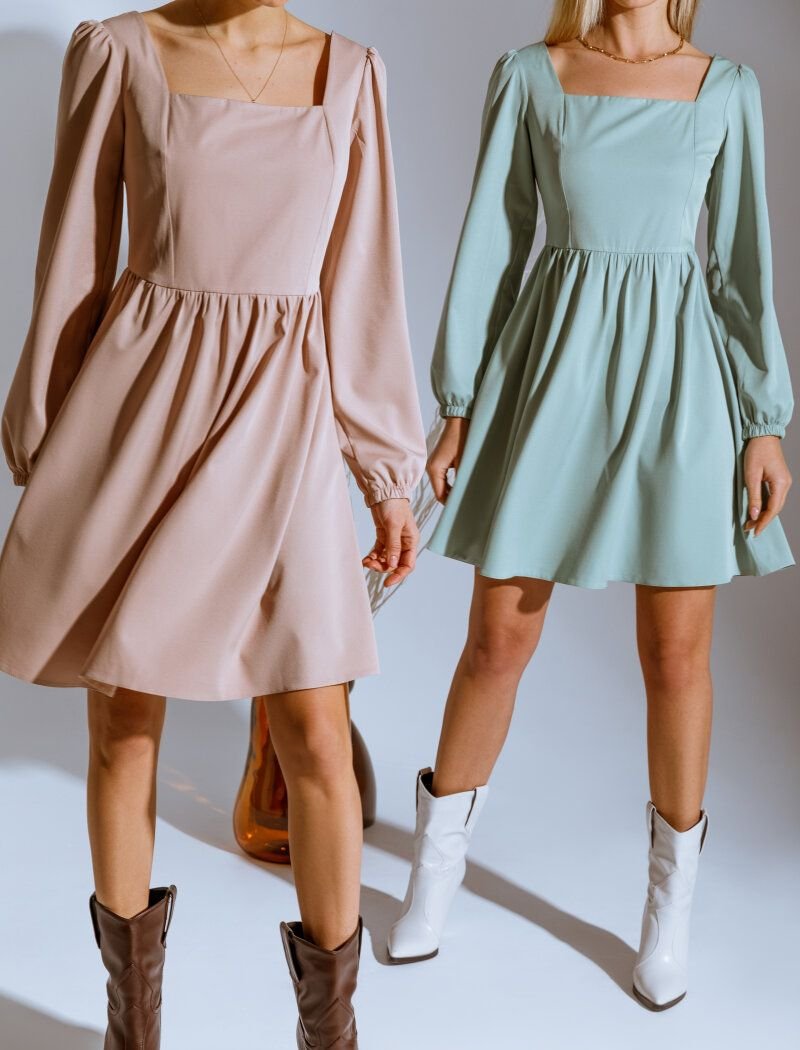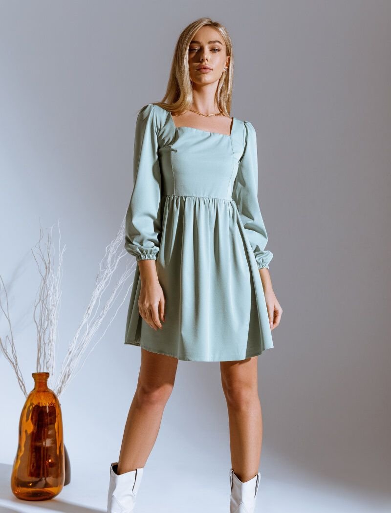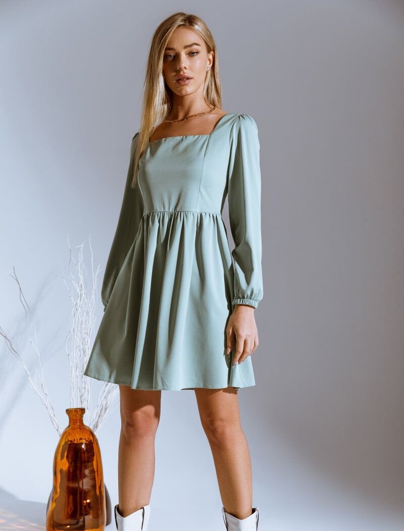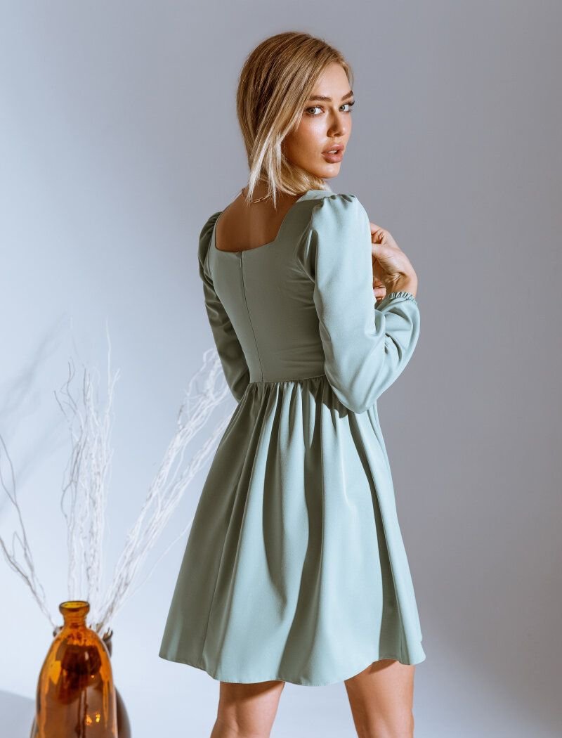A mini dress in a mint shade with a fitted cut is ideal for bows in a romantic style. A square square neckline accentuates the decollete area, and the final accent of the image is put by loose sleeves on elastic cuffs.
