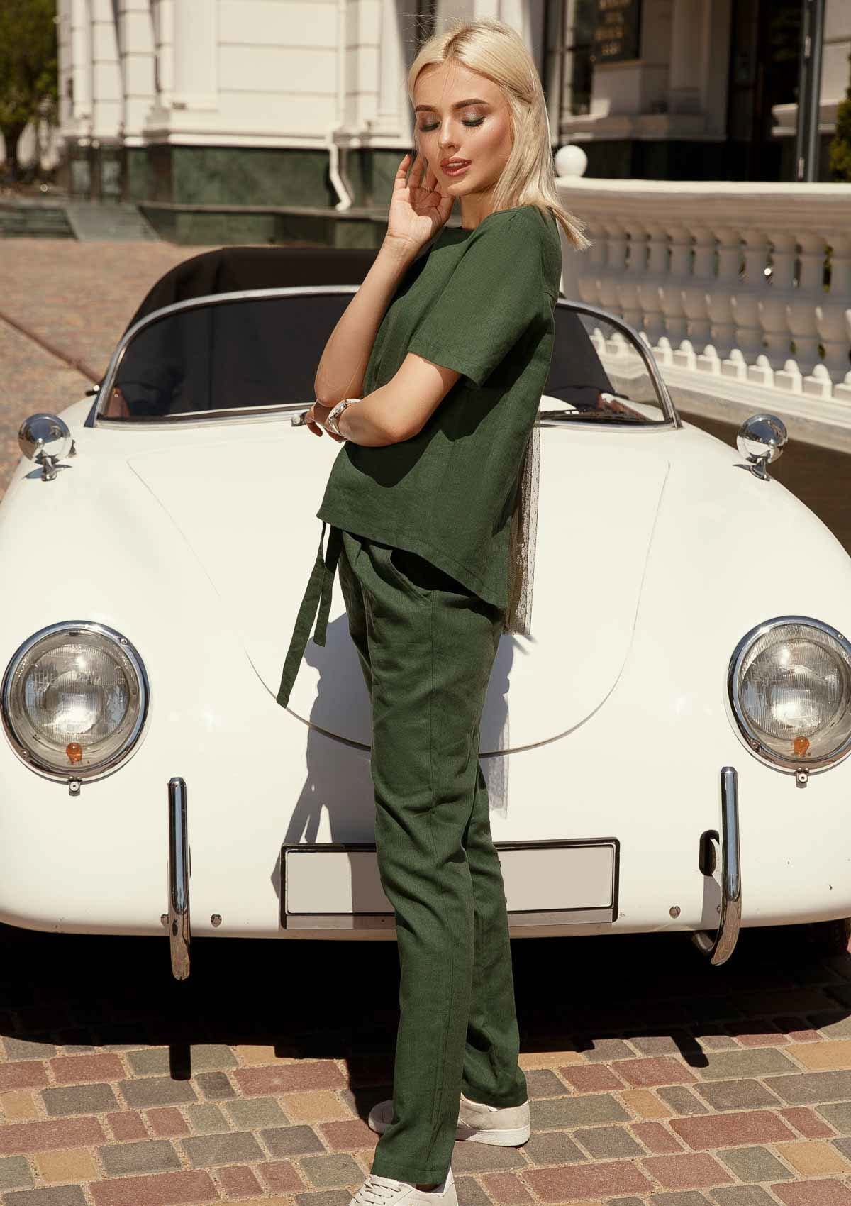 Summer suit made of linen fabric: a loose top with short sleeves and a mesh insert on the back, medium-fit trousers with a fixed lapel, elastic waistband, welt pockets and drawstring ties.