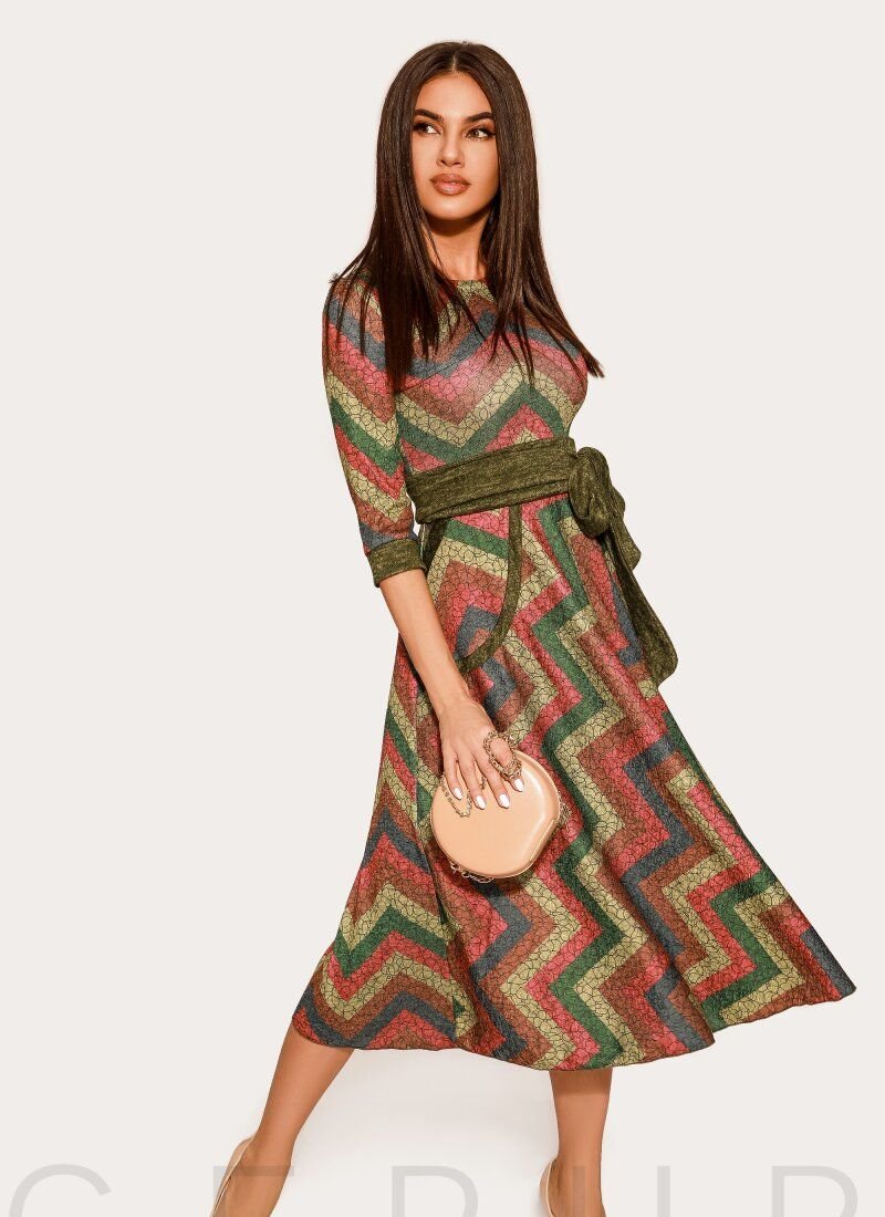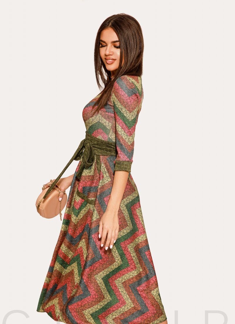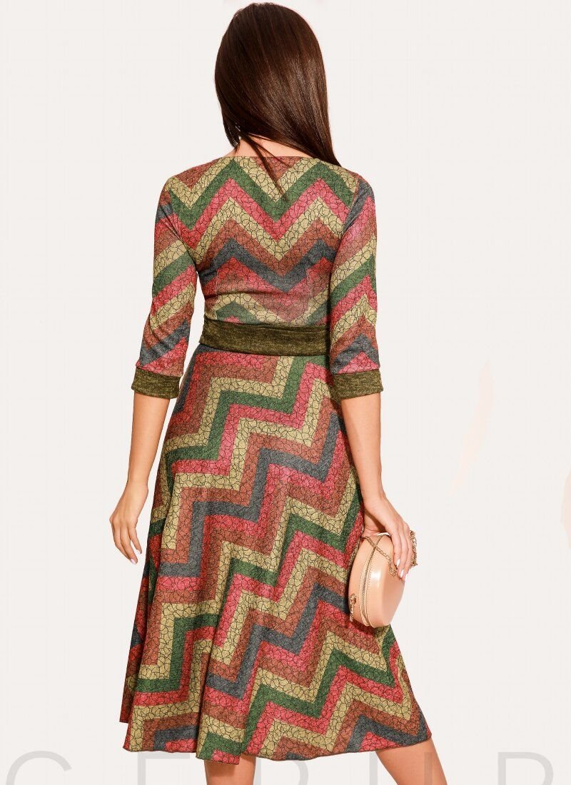 A flared knitted dress in an abstract print: round neck, a ¾ sleeve with a solid cuff, a cut-off waist with an elastic insert and a skirt in a light fold with two welt pockets.