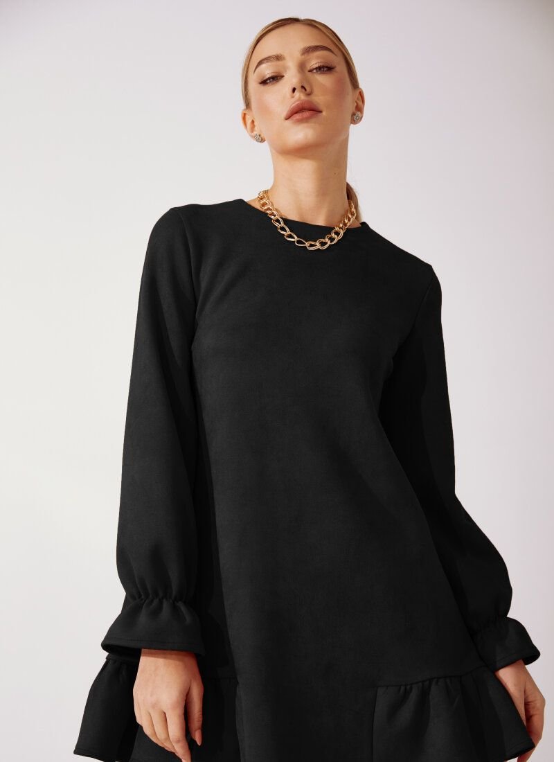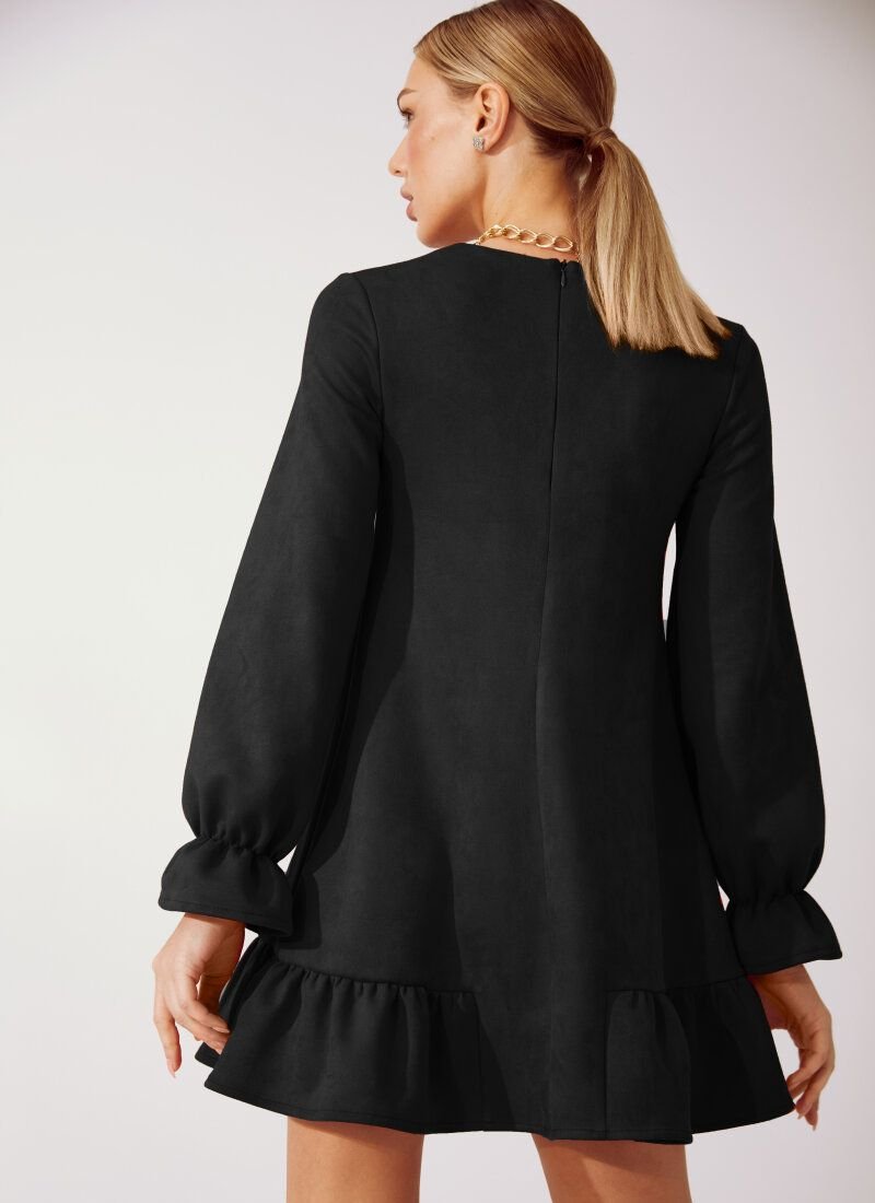 A mini dress equates beauty and convenience. Soft suede material fits nicely to the body. The model is complemented by a flounce at the hem and elastic cuffs on long sleeves. In combination with sneakers, such a thing will be an ideal example of what you can look feminine in shoes without heels.