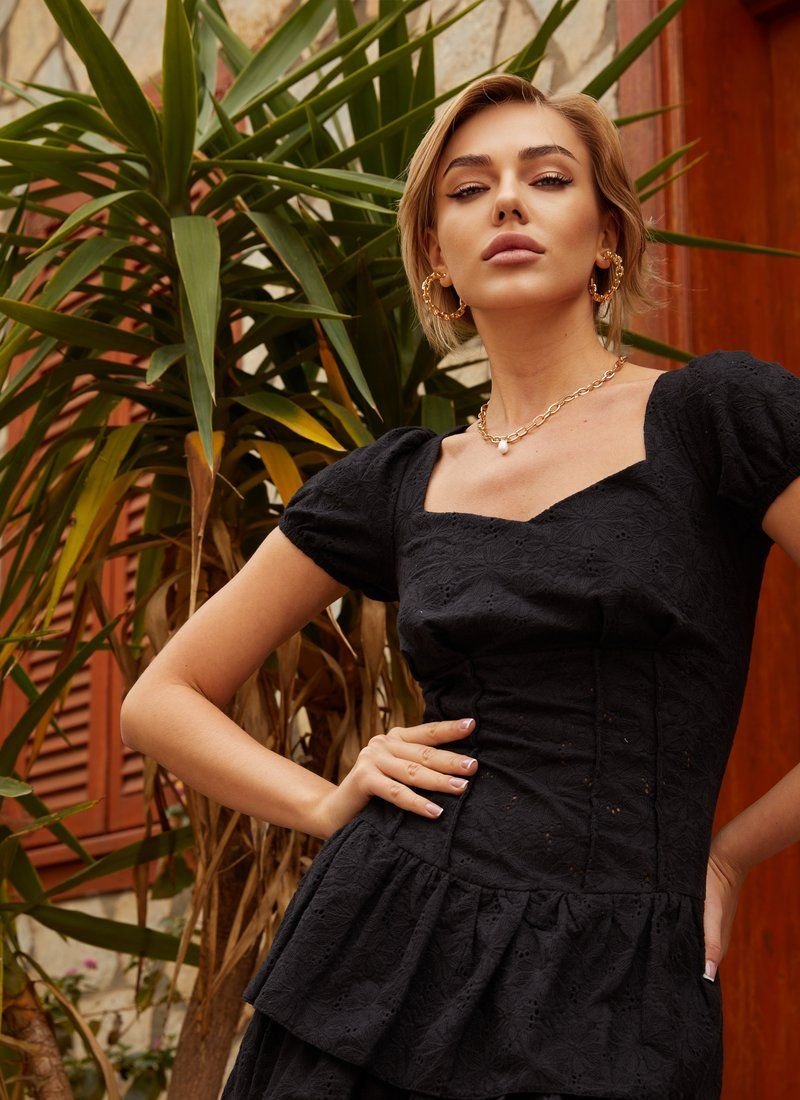 A short dress will make you look feminine. The mixed cotton model was decorated with sophisticated floral embroidery. The romantic mood set by the material was supported by lantern sleeves and a skirt made of flounces. Such a thing will look good with stiletto sandals and ballet flats.