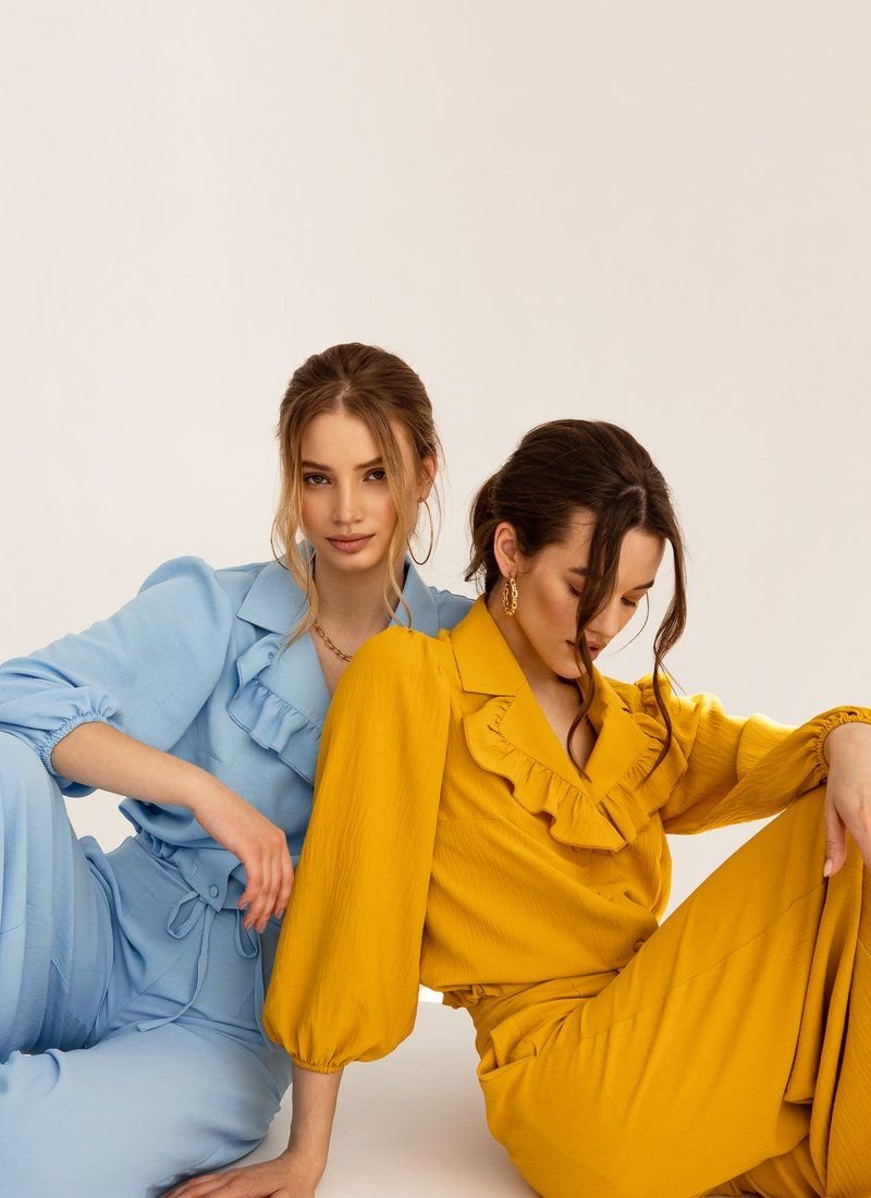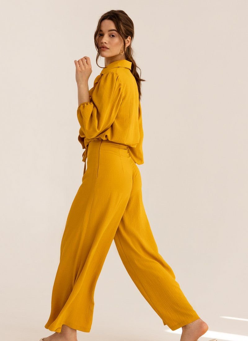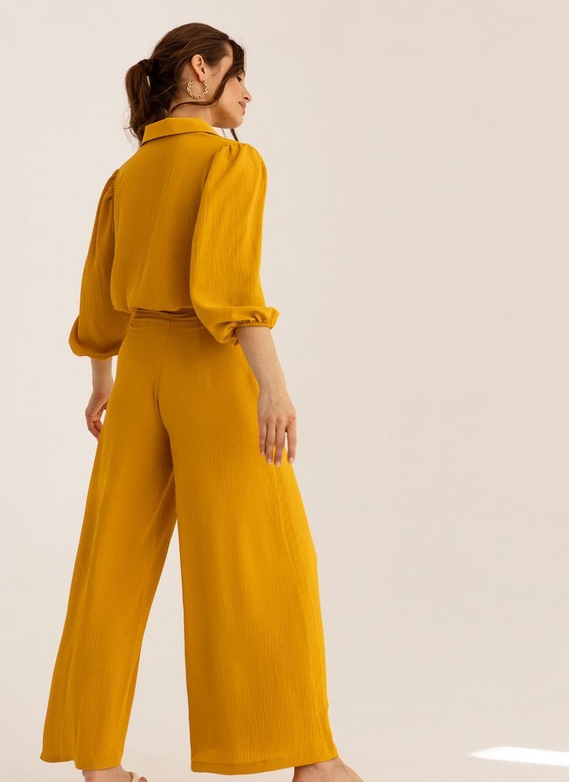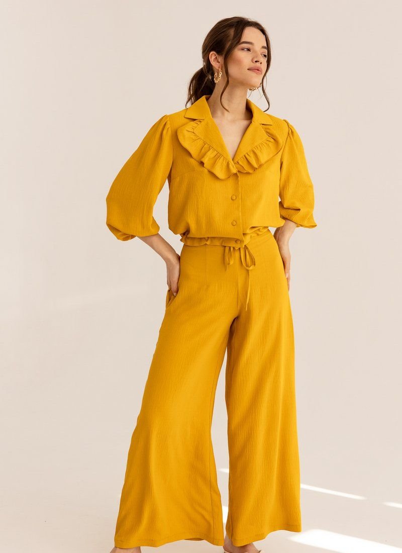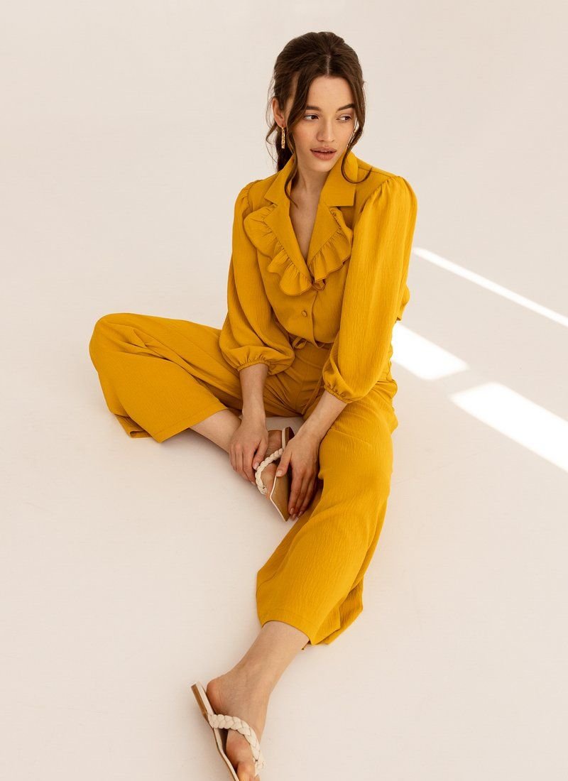 A mustard suit with a jacket and flared trousers is made of a lightweight material that allows the skin to breathe in hot weather. The loose cut of the model supports the most up-to-date silhouette in SS'21. The jacket was complemented with a turn-down collar with ruffles and a drawstring at the bottom edge.