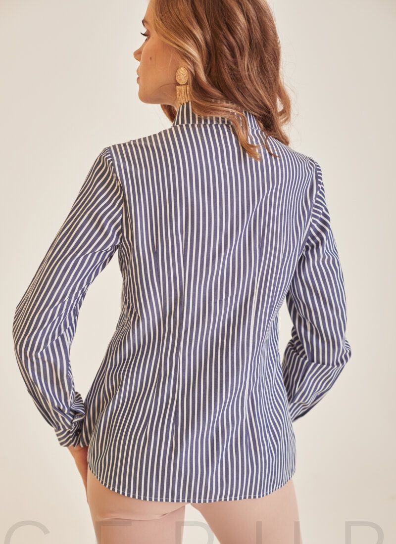 Shirt with a combined striped print of classic color. Stand-up collar, long sleeve, button placket in front. Loose fit and elongated back.