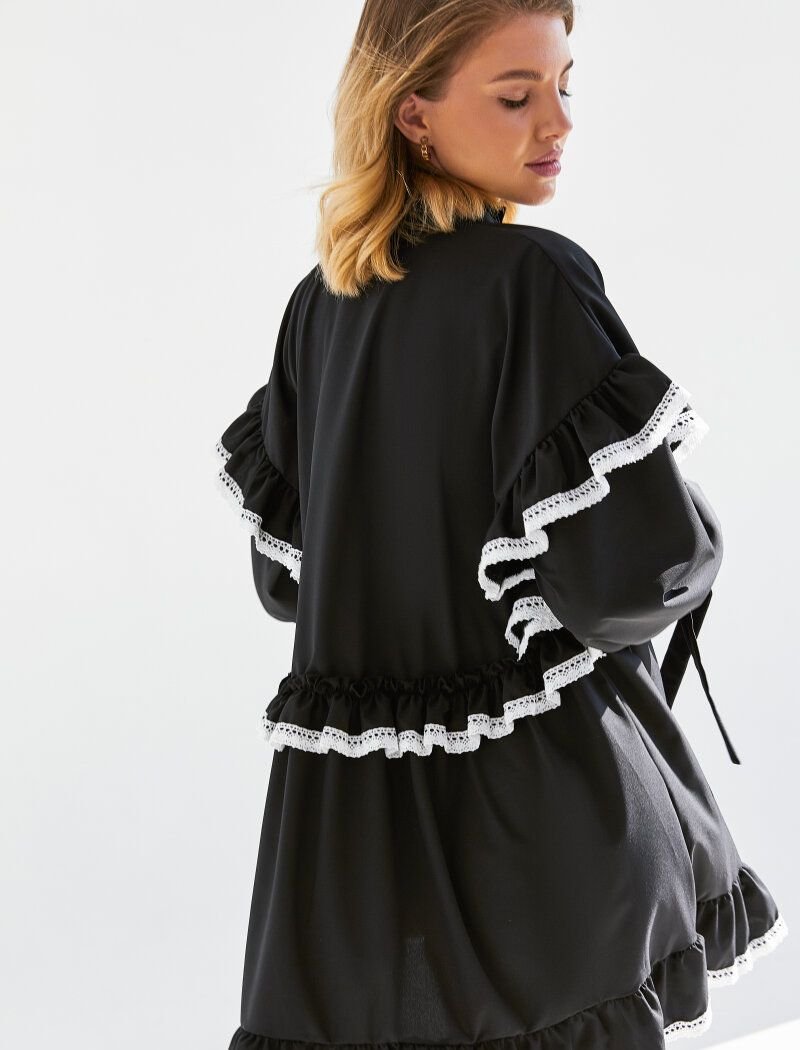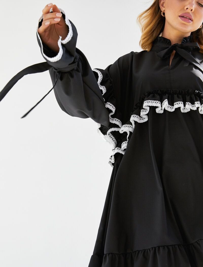 The black dress is made of a lightweight material that maintains an optimal body temperature. The relaxed silhouette was decorated with flounces with contrasting openwork lace. The ascot collar emphasizes the neck.