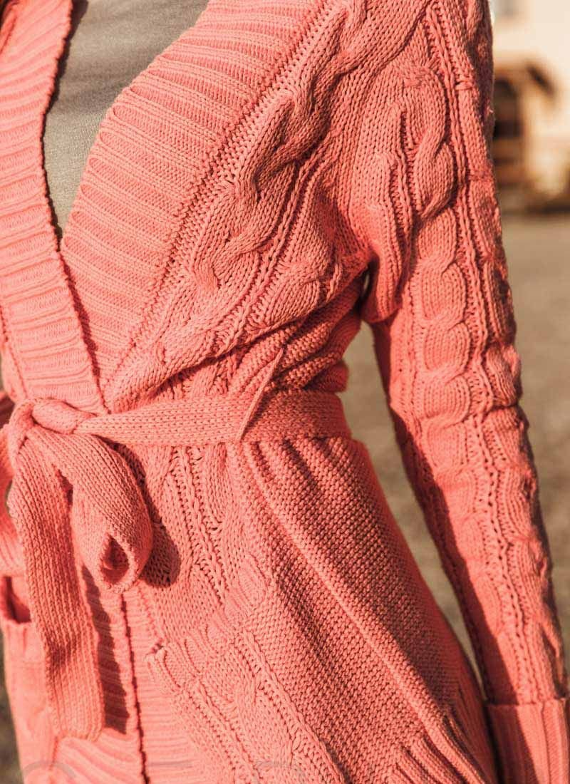 A cozy cardigan in delicate pink with pockets in the front, a long sleeve with a fixed cuff, a wide elastic band at the bottom and a removable belt to match.