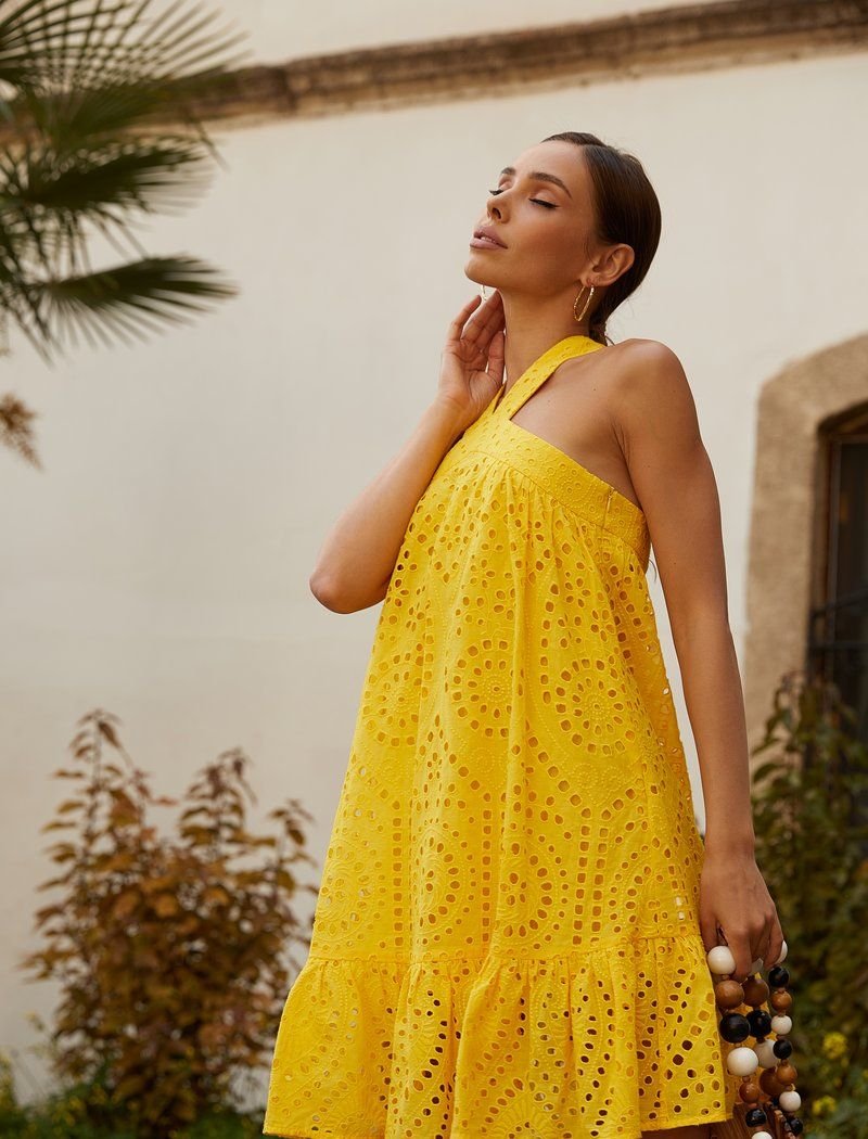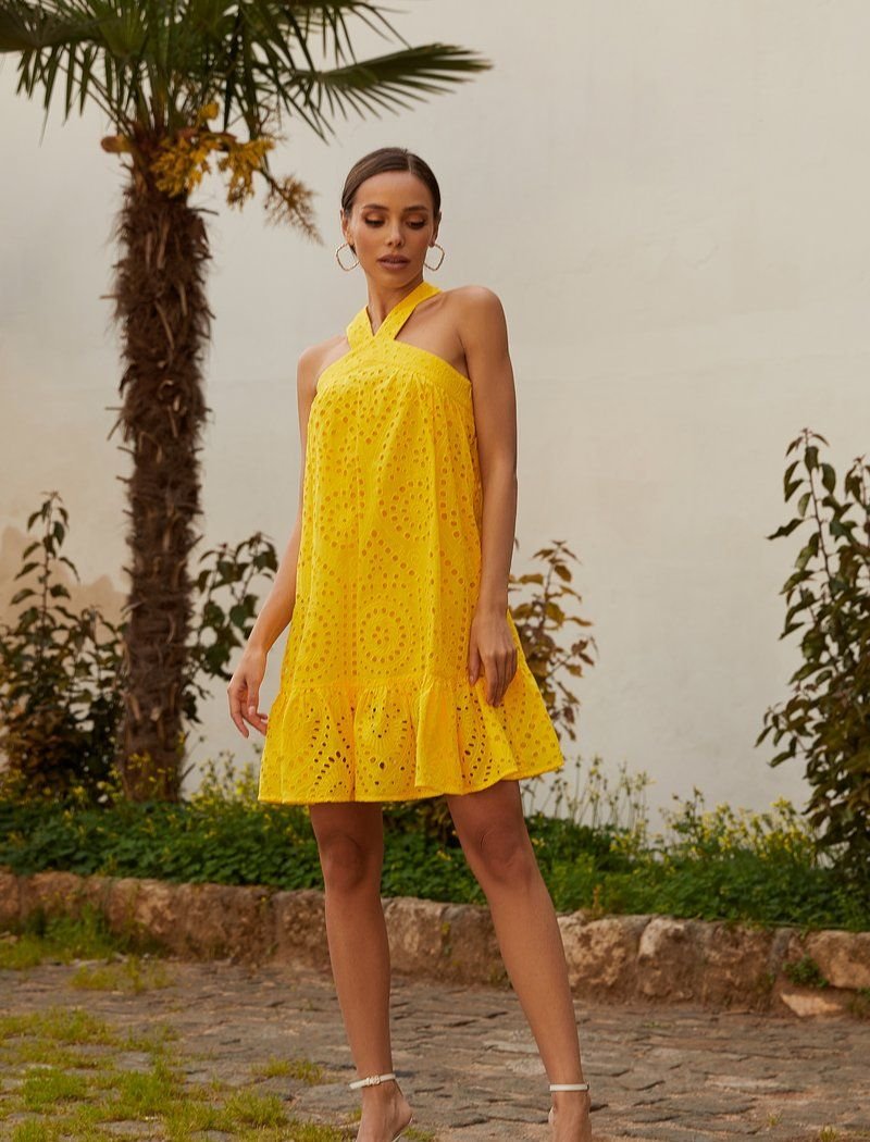 In the 2021 season, halter tops returned to the catwalks tops with a strap thrown over the neck. A yellow mini dress with cross straps on the back supports this trend. The model is made of openwork material with embroidery. The loose cut was supplemented with a flounce on the hem.