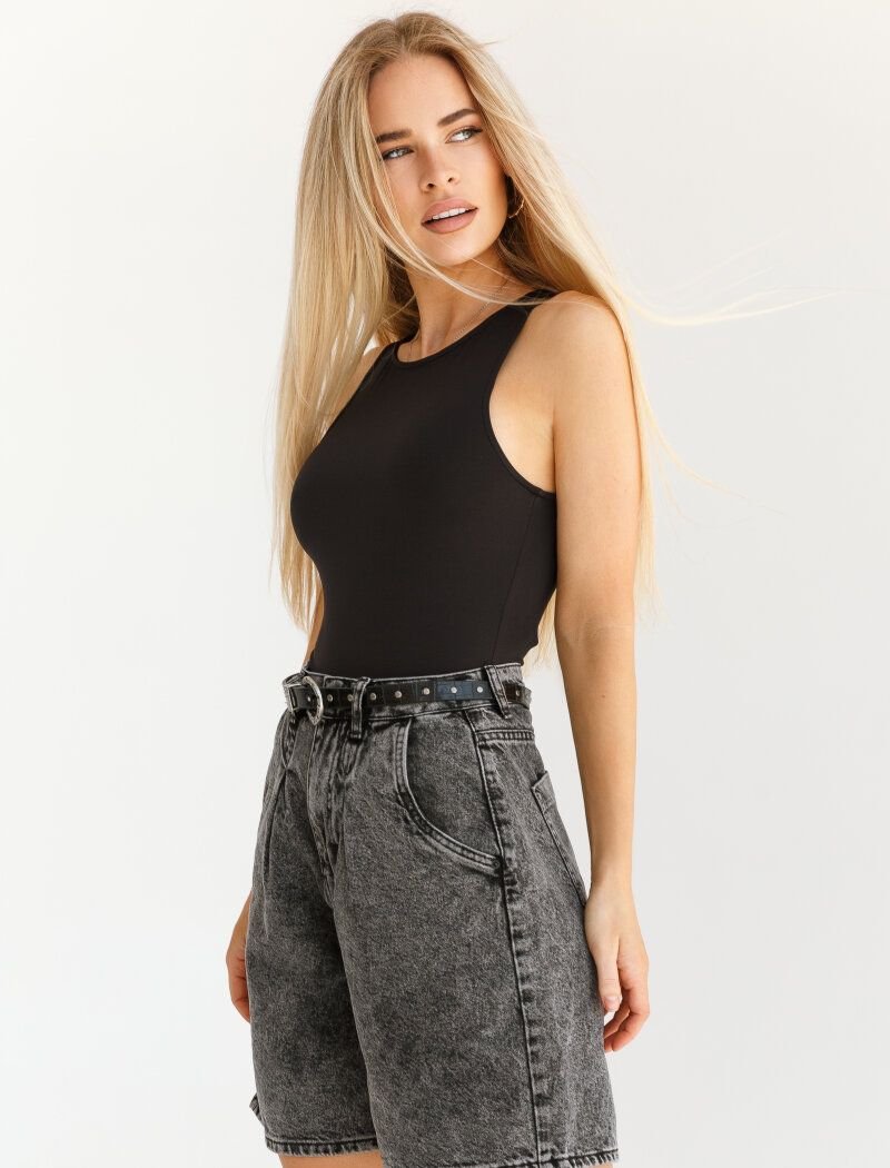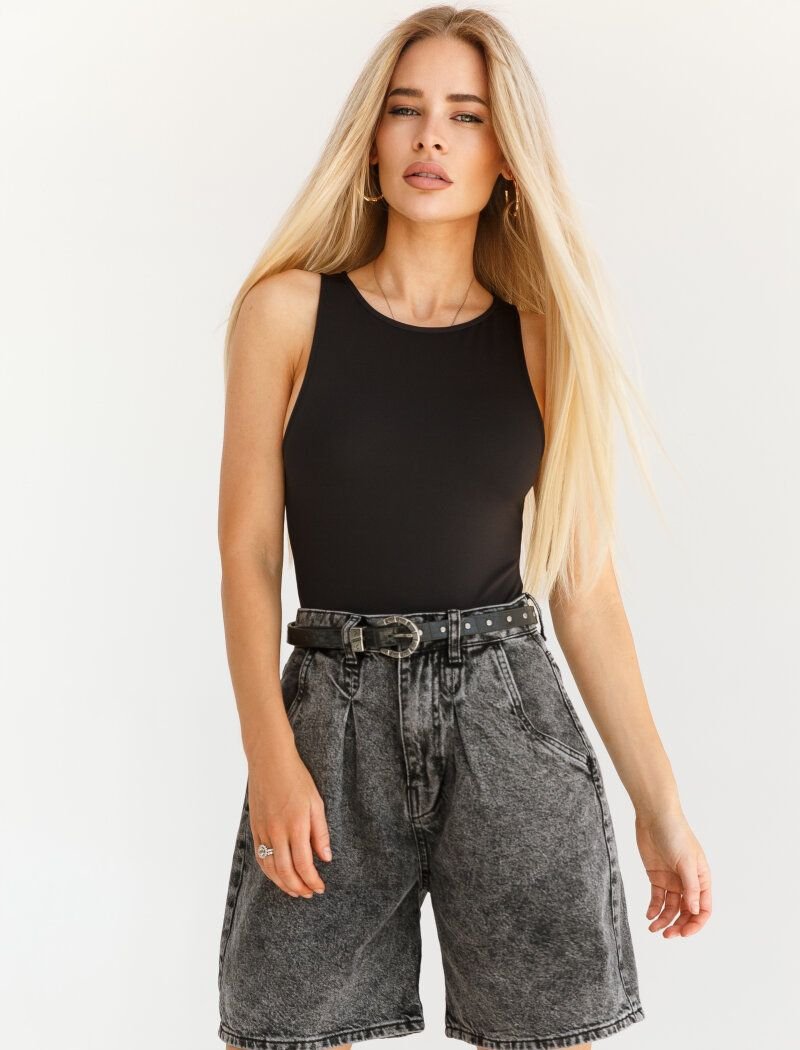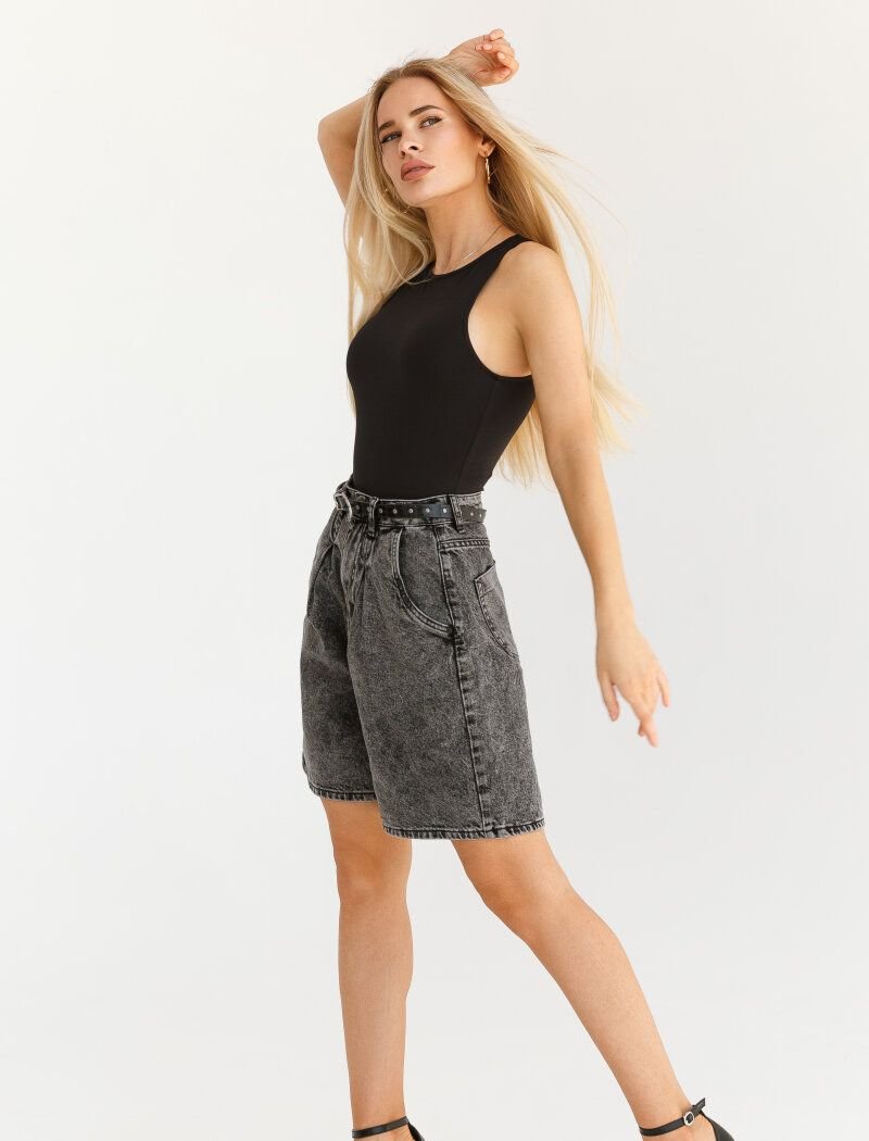 Denim Bermuda shorts are the trend of summer 2020, which the designers of the Gepur brand have included in the new collection. Gray denim with the effect of welding looks great with both sports and open shoes. Shorts will be the perfect base for creating an image in the casual style.