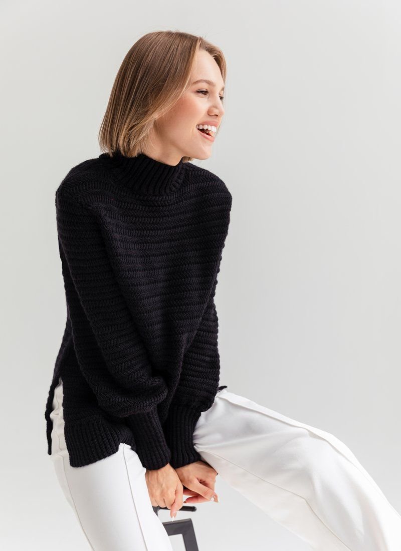 Elongated black sweater with small slits on the sides, stand-up collar. This model is made with long wide sleeves with cuffs.