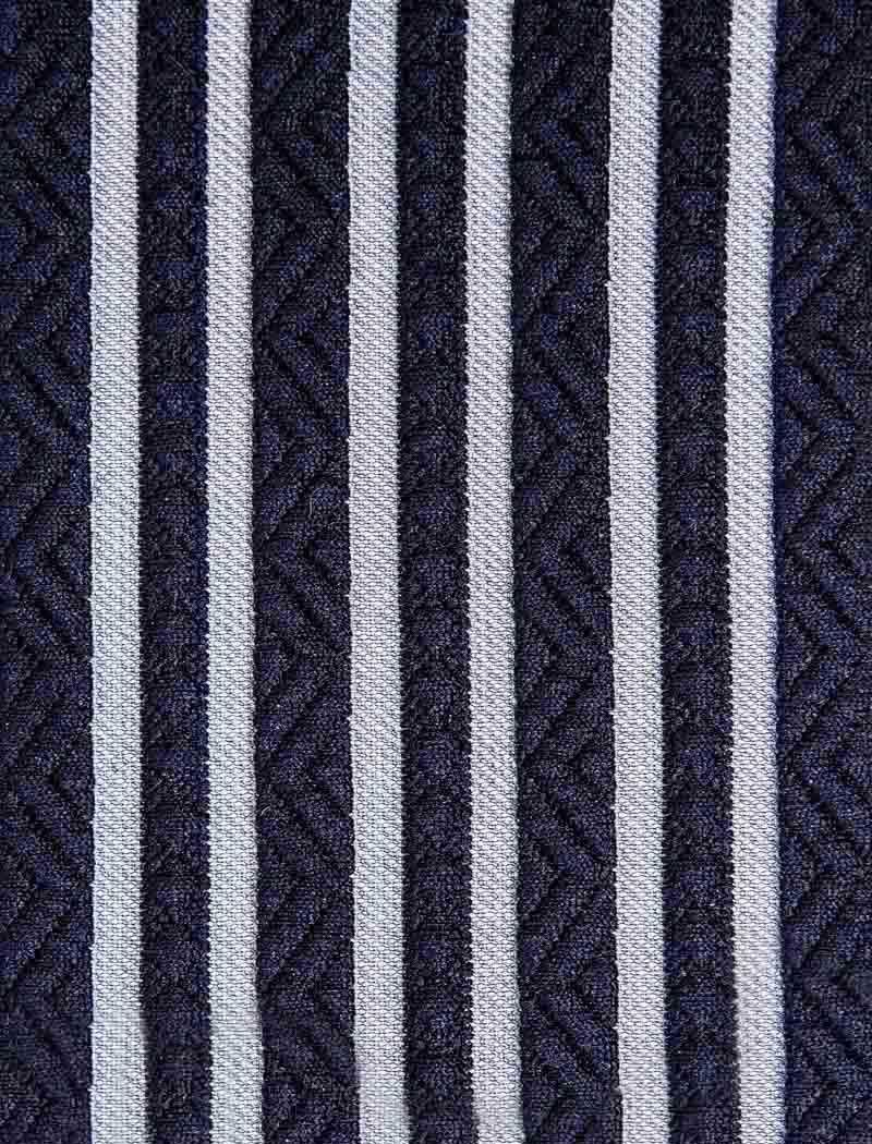 A striped knitted dress with contrasting elements: an unusual rounded hem with decorative buttons, a 3/4 sleeve with a cuff and a chest pocket with a "handkerchief".