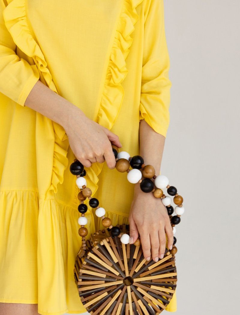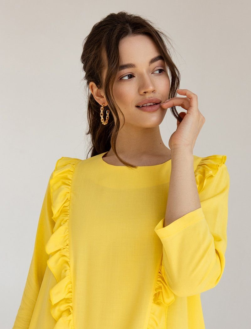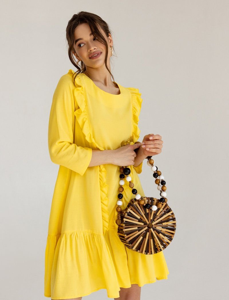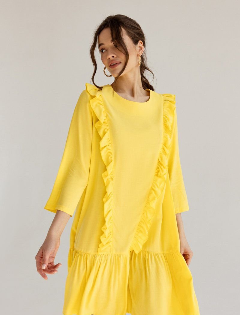A loose dress is the epitome of romance. The yellow shade and vertical ruffles work for the right impression. A wide flounce on the hem supports the image.