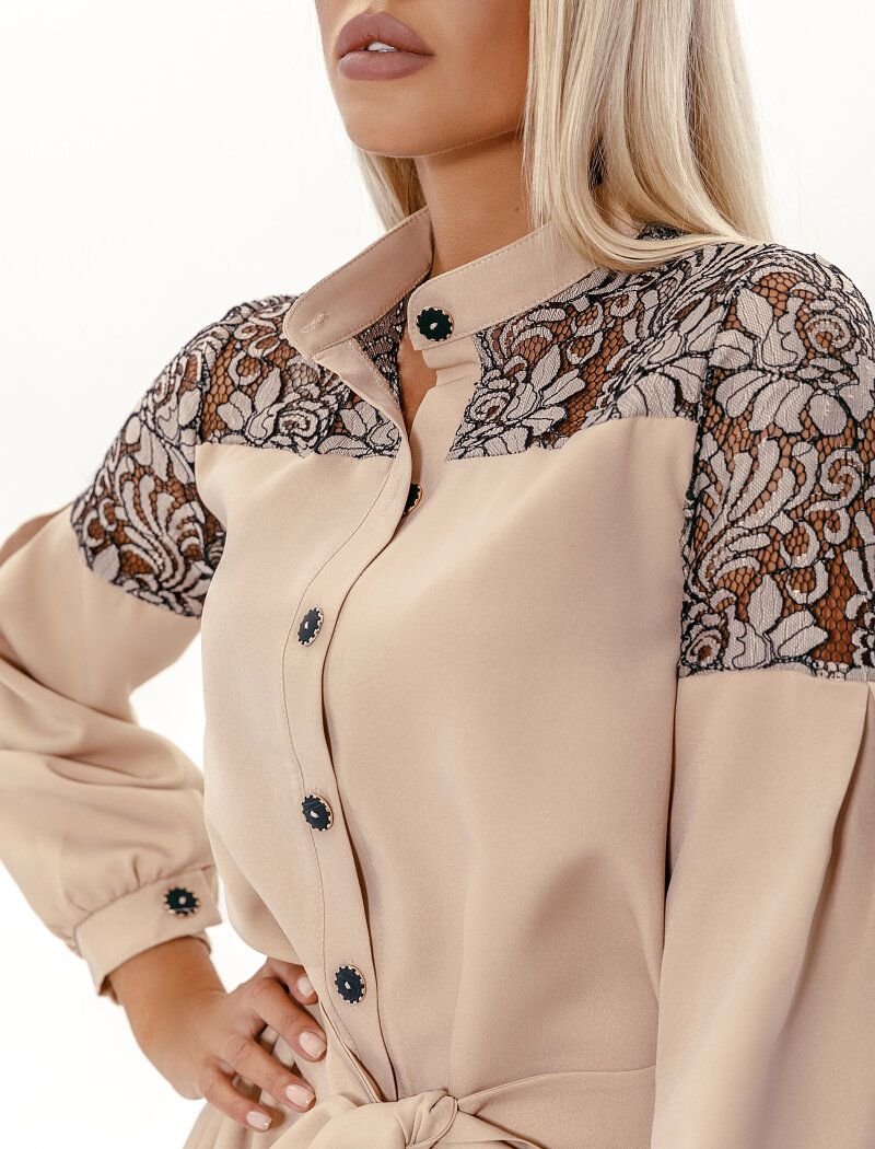 A sophisticated beige a-line dress: a stand-up collar, a yoke with contrasting lace, a voluminous long sleeve with a wide cuff, a placket with contrasting buttons in the front and a plain belt.