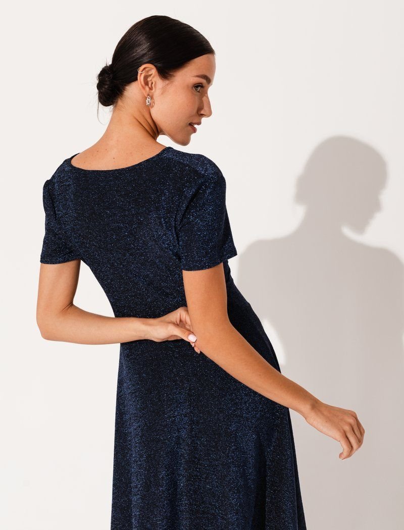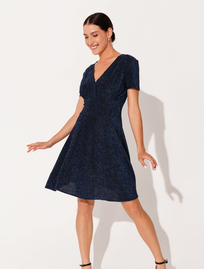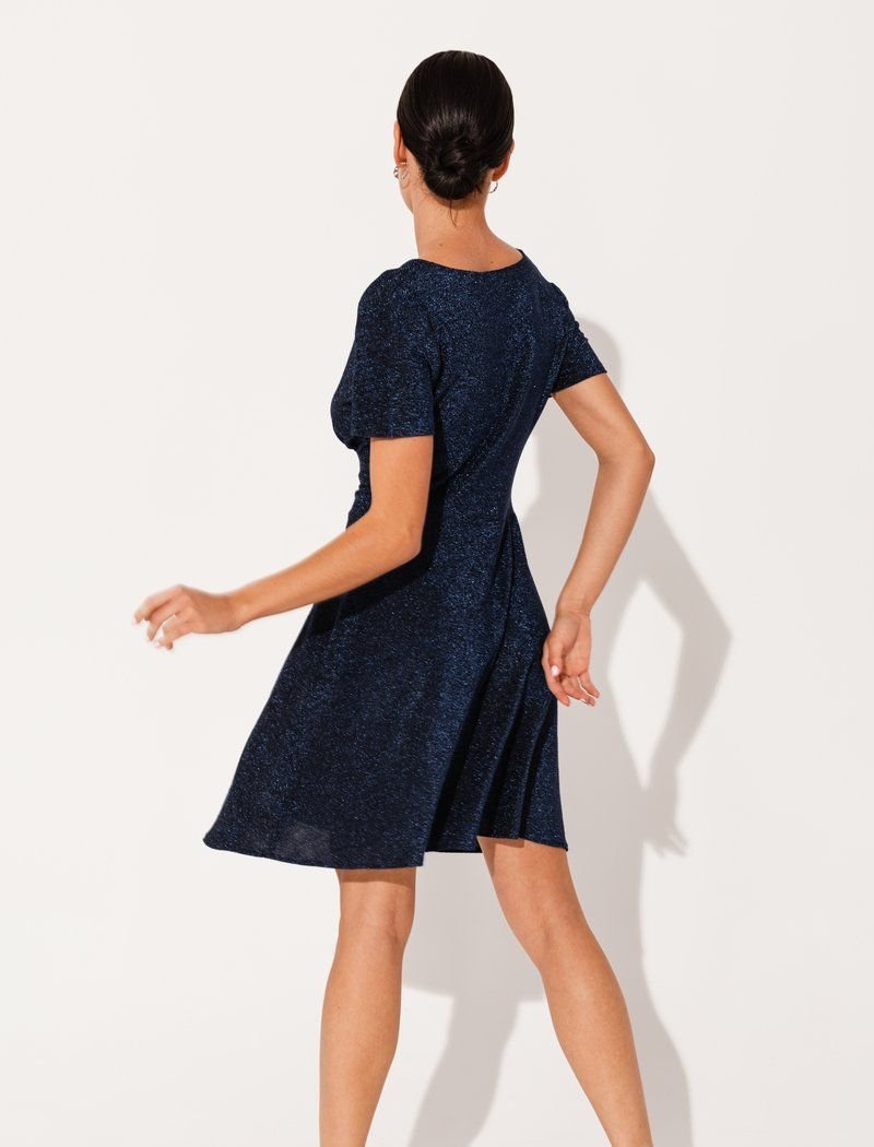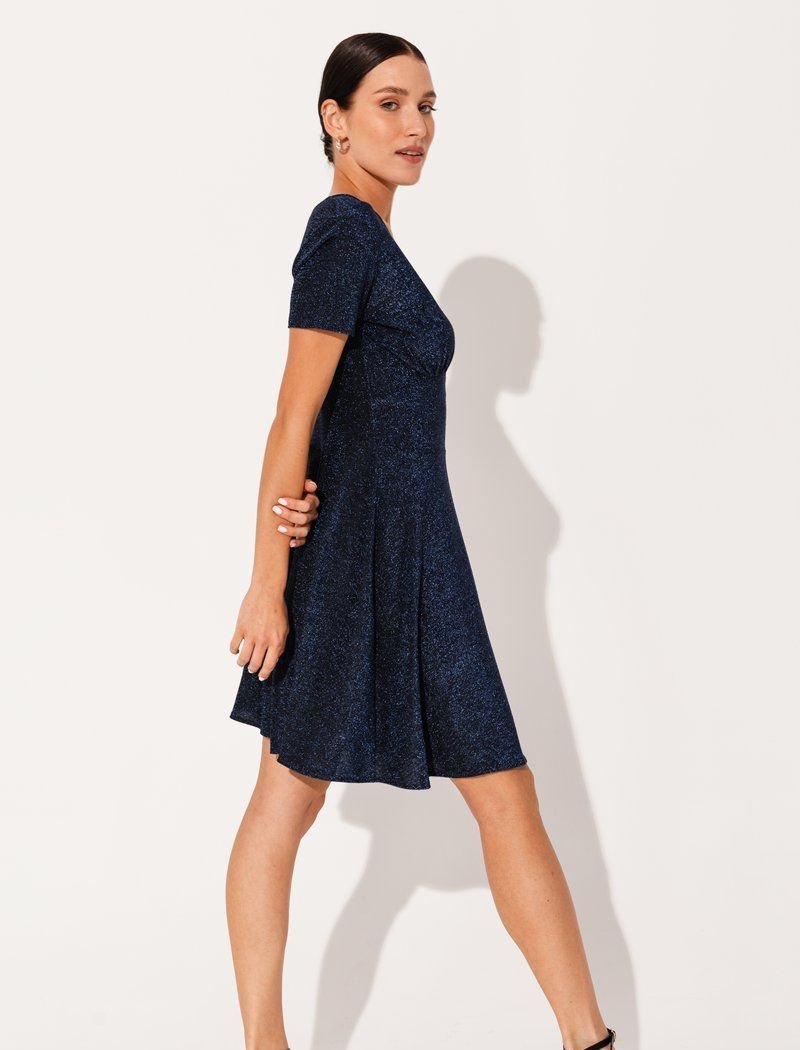 A small blue dress creates a wow effect, due to a fitted silhouette, a v-shaped deep neckline and a wide waistband. The shimmer created by the material with lurex also acts as a decor.