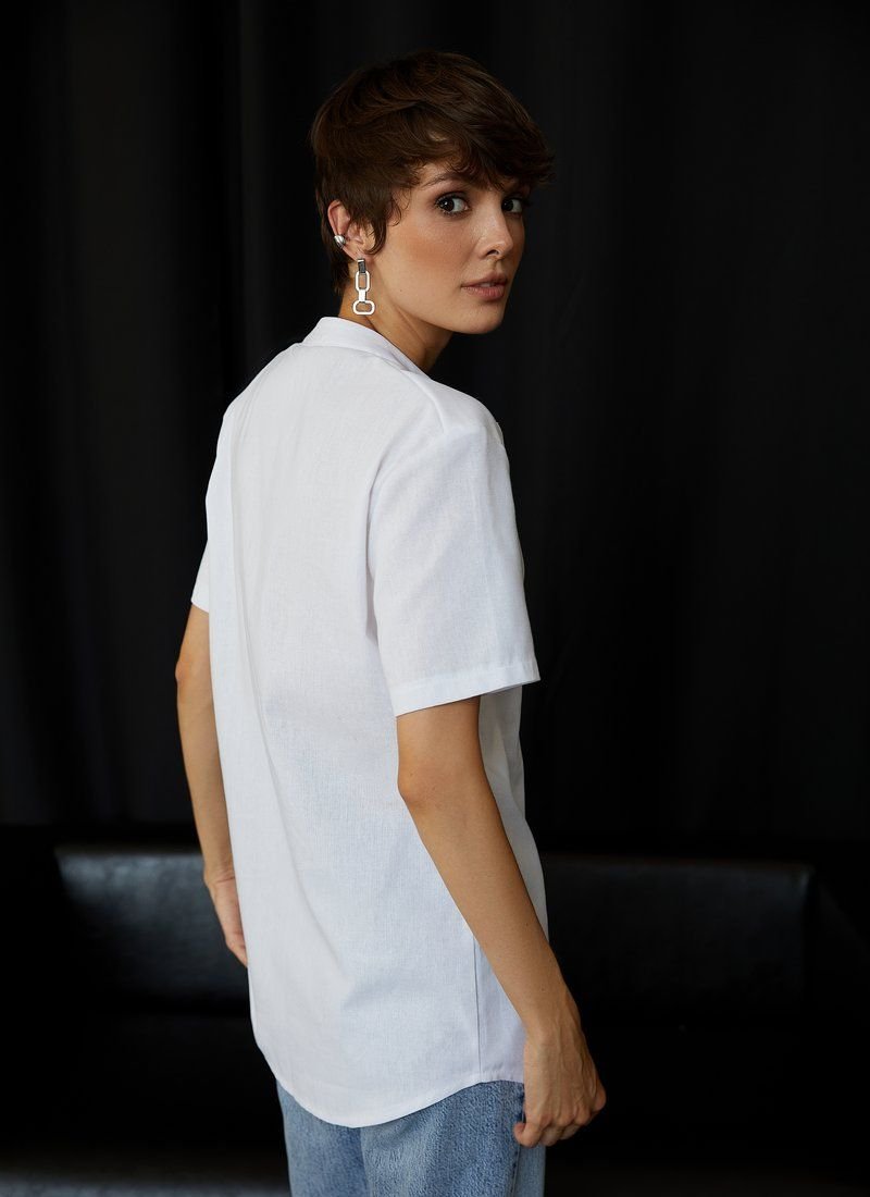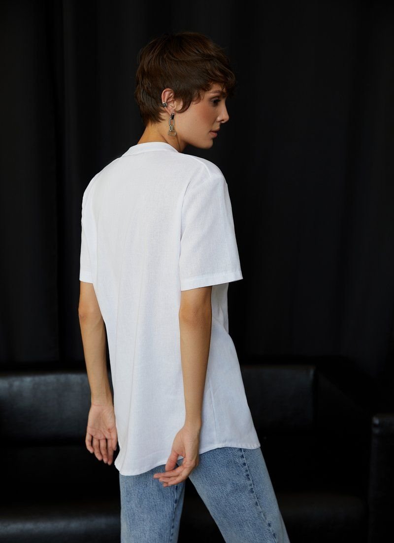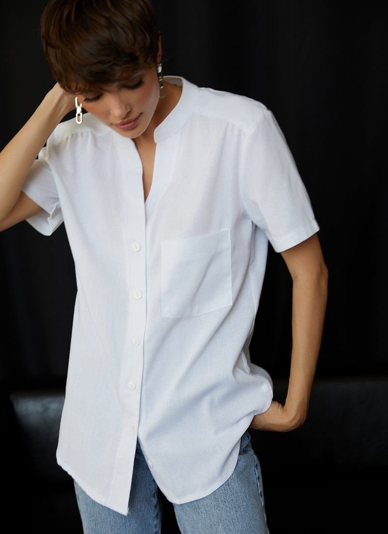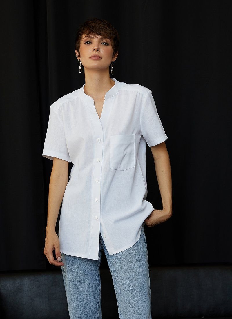 White elongated straight-cut shirt with a straight collar and short sleeves. Front buttons along the entire length and a pocket on the chest on one side.