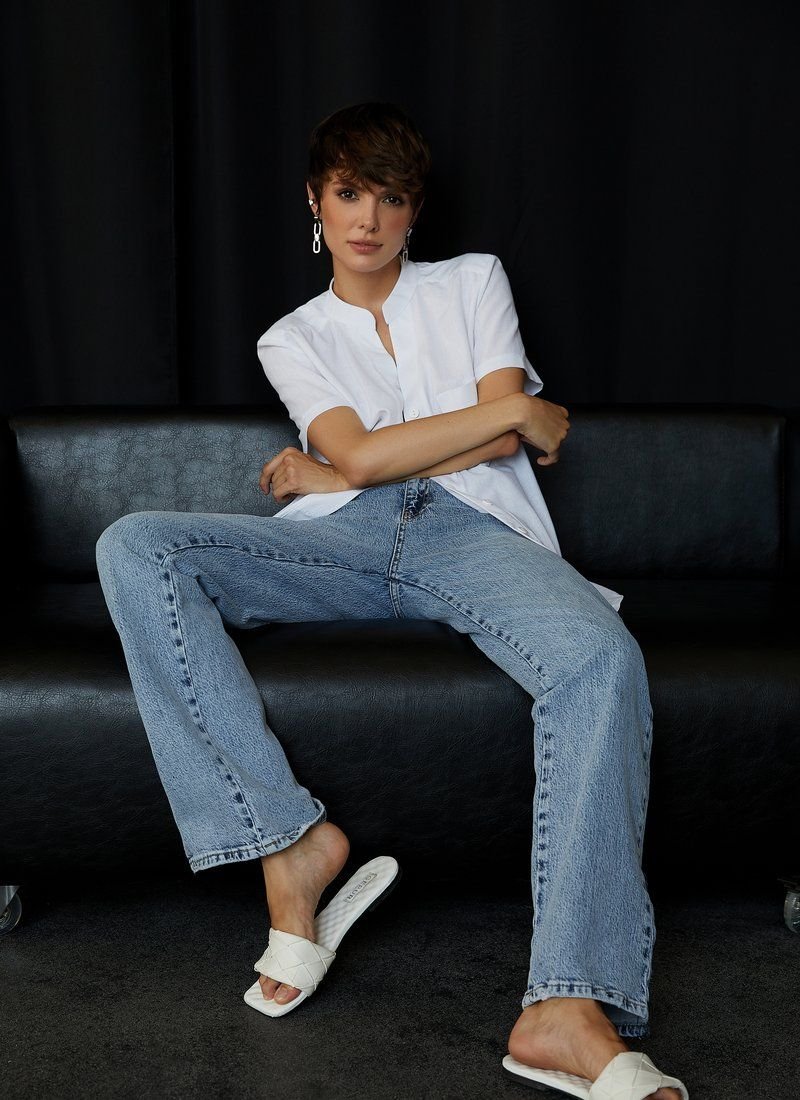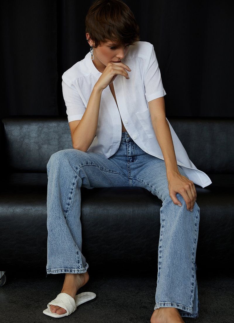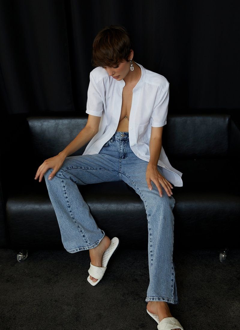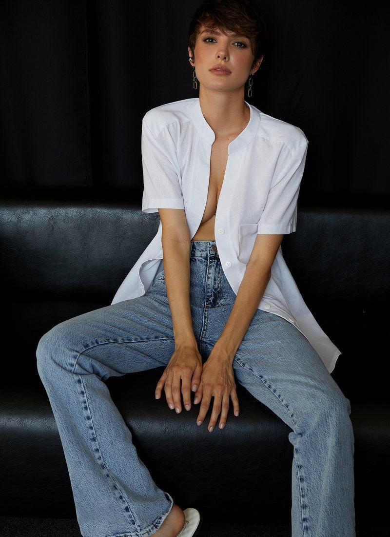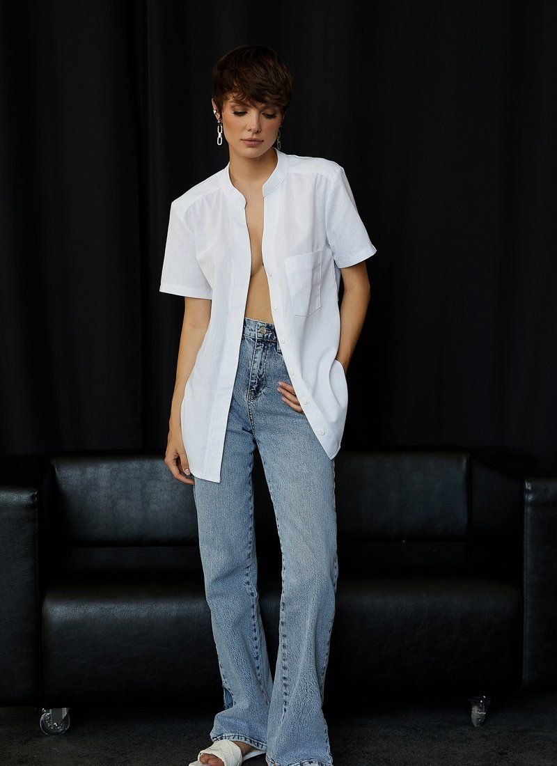 White elongated straight-cut shirt with a straight collar and short sleeves. Front buttons along the entire length and a pocket on the chest on one side.