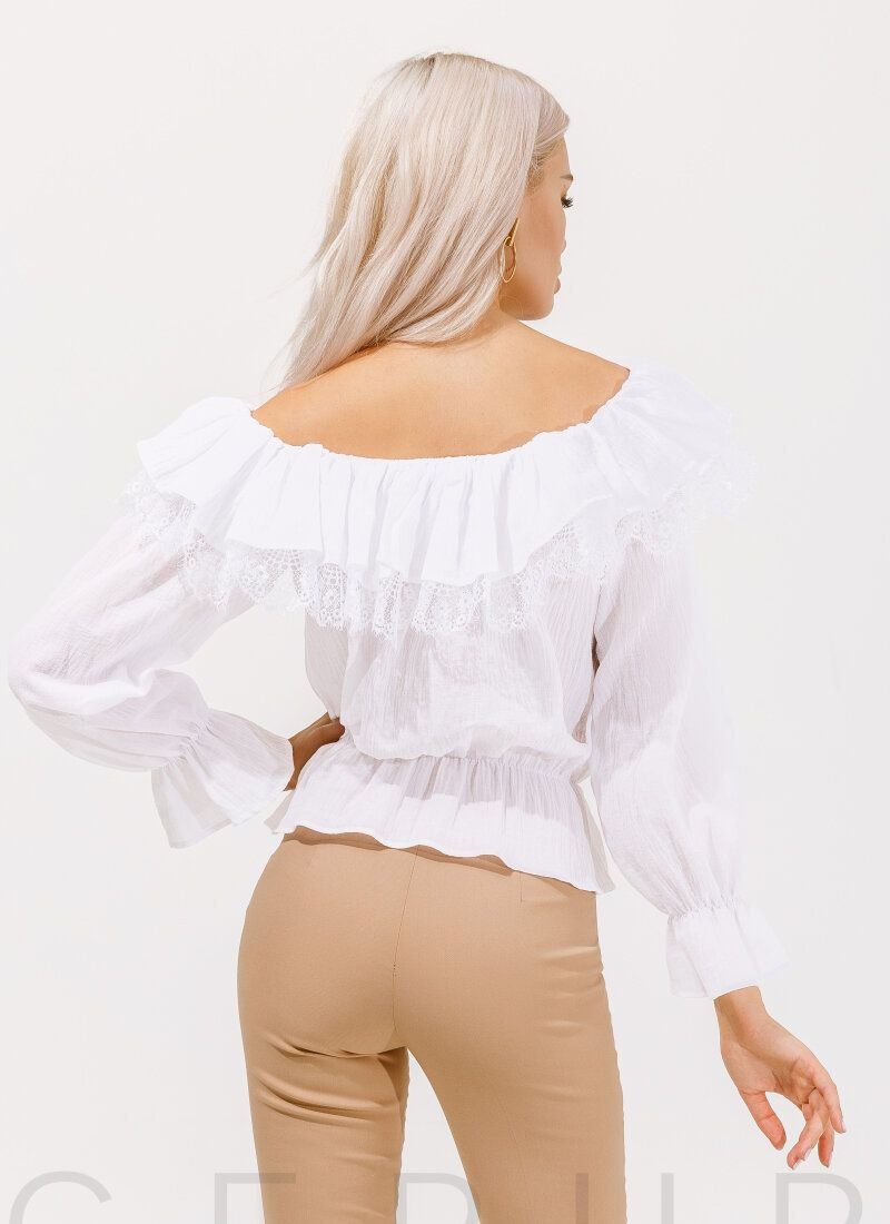 A spectacular blouse decorated with sophisticated lace. Elastic insert on the shoulders and bottom edge, voluminous sleeves and flounces.