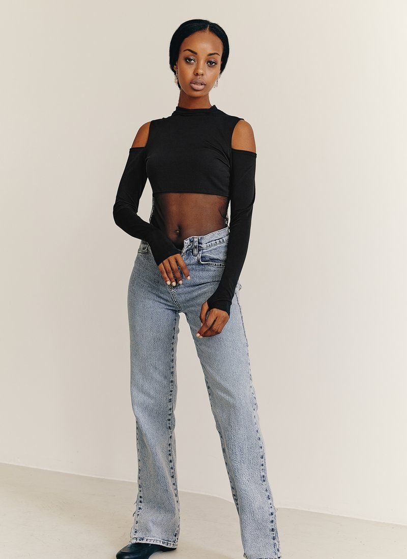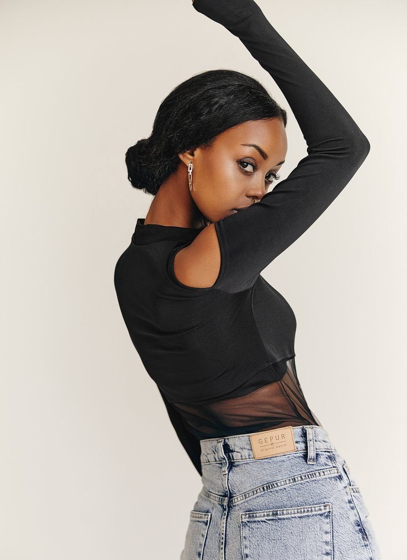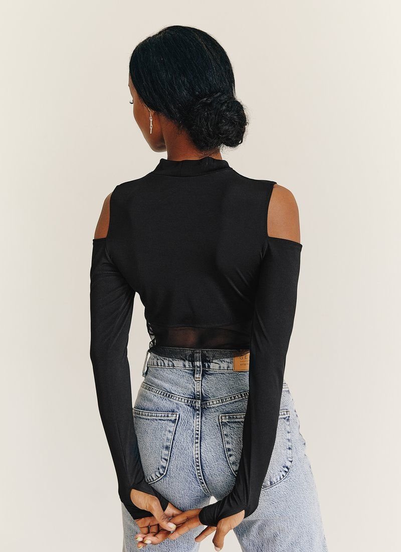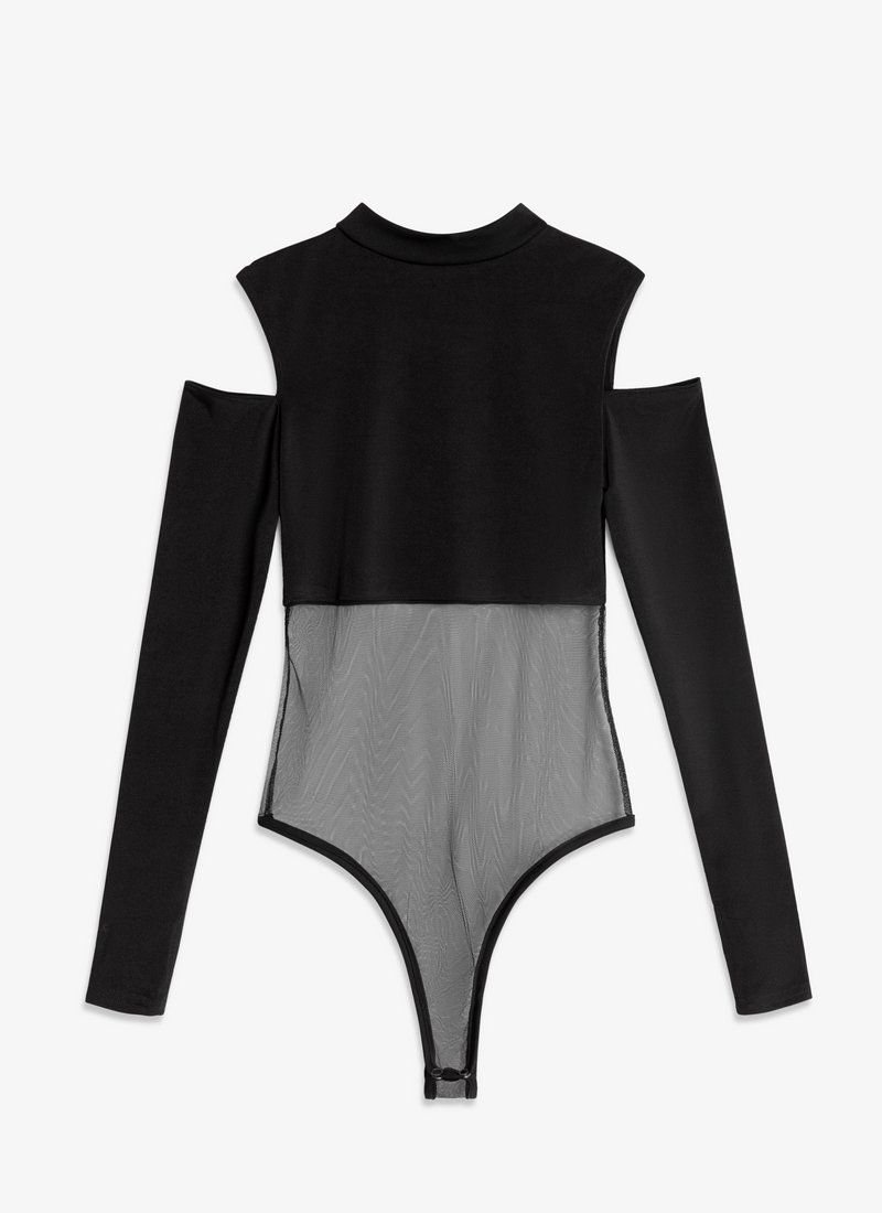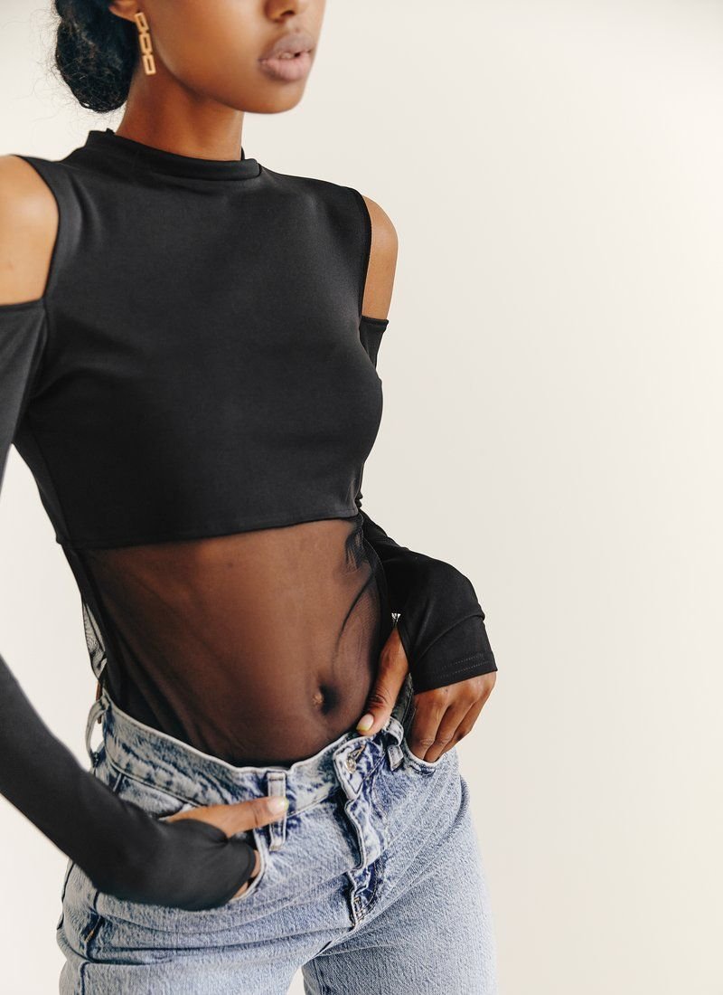 Black bodysuit with a stand-up collar, open shoulders, long sleeves with cutouts for thumbs. The lower half of the body is made of mesh, which will be an interesting detail of your image.