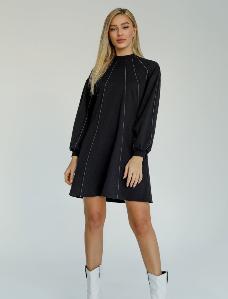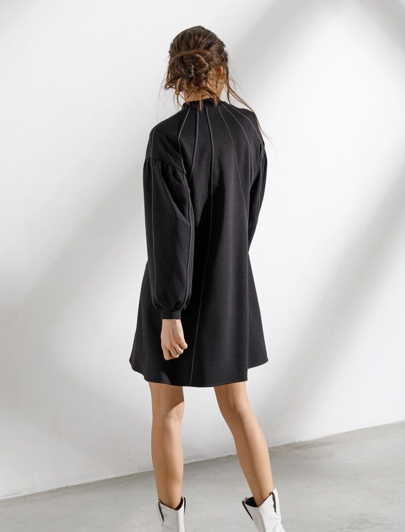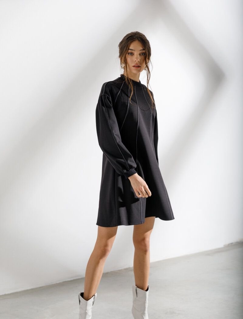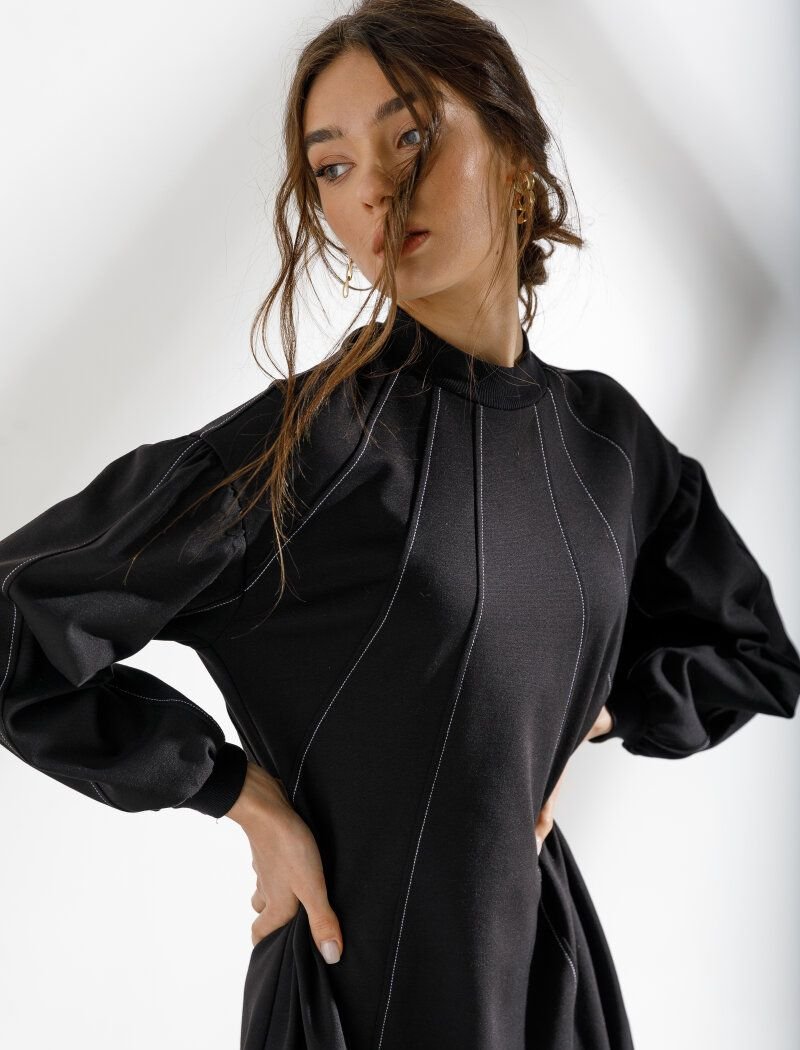 A loose black dress from the new collection of 2021 has become more expressive due to decorative contrasting stitches descending from the collar. Gepur designers have supplemented the model with an actual element of the Fendi and Balenciaga shows in the FW20/21 season voluminous sleeves.