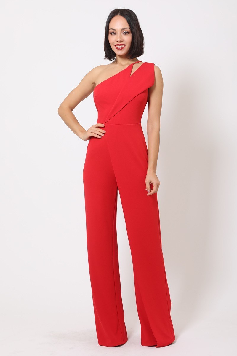 ImportedS.M.L One shoulder jumpsuit w/ small opening. Frontline Flared Leg Design, Back zipper95% Polyester 5% Spandex RedVAL