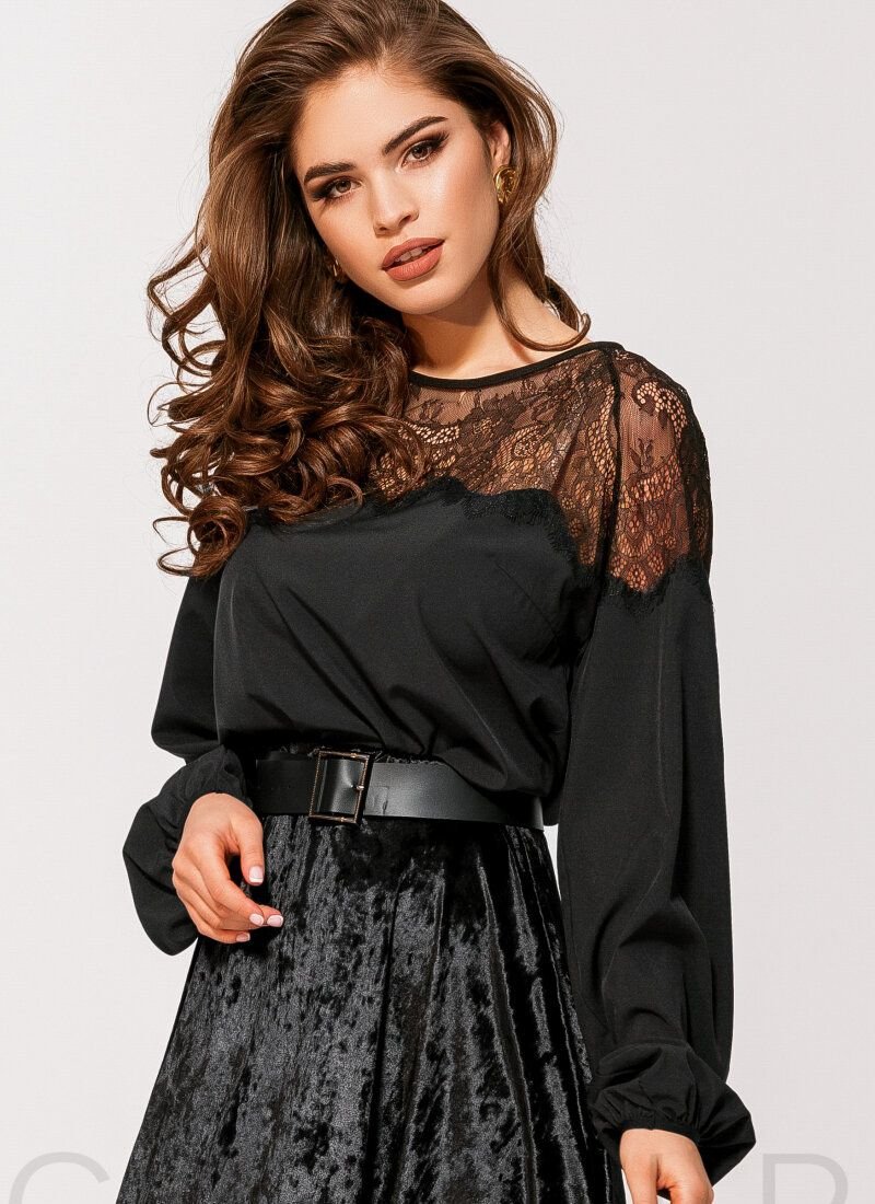 Romantic blouse of restrained black color: loose silhouette, round neck, long voluminous sleeve on elastic cuff, the yoke is decorated with refined lace.