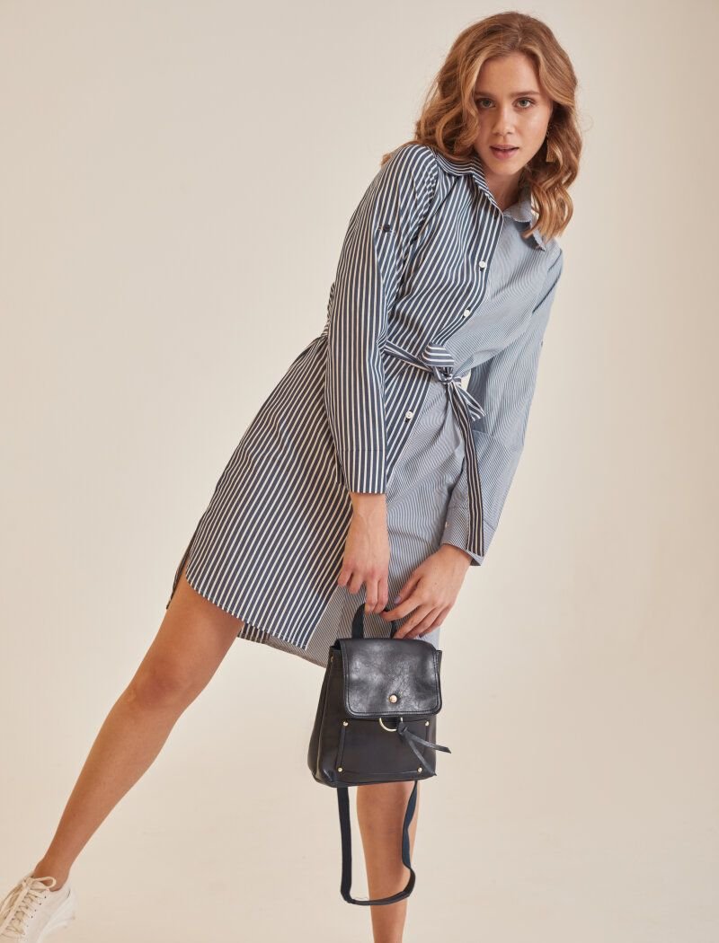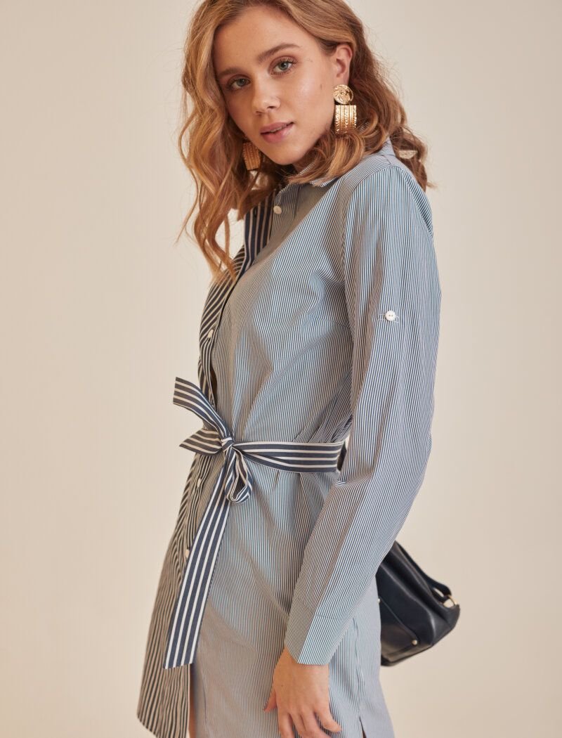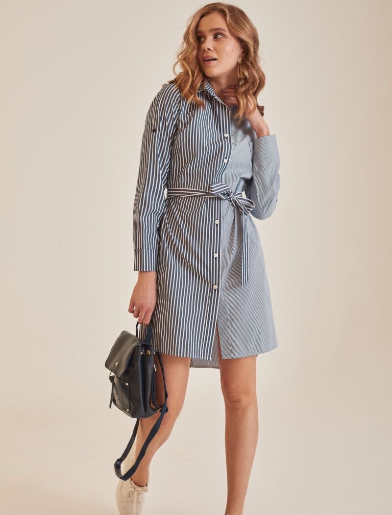 Shirt dress in a combined striped print. Turn-down collar, long sleeve on a wide cuff with a patch closure. A button-down placket in the front, pockets in the seams, an elongated back and a removable fabric belt.