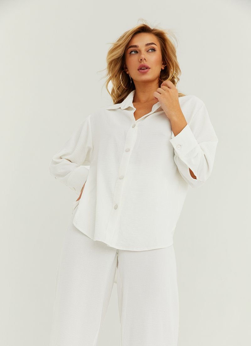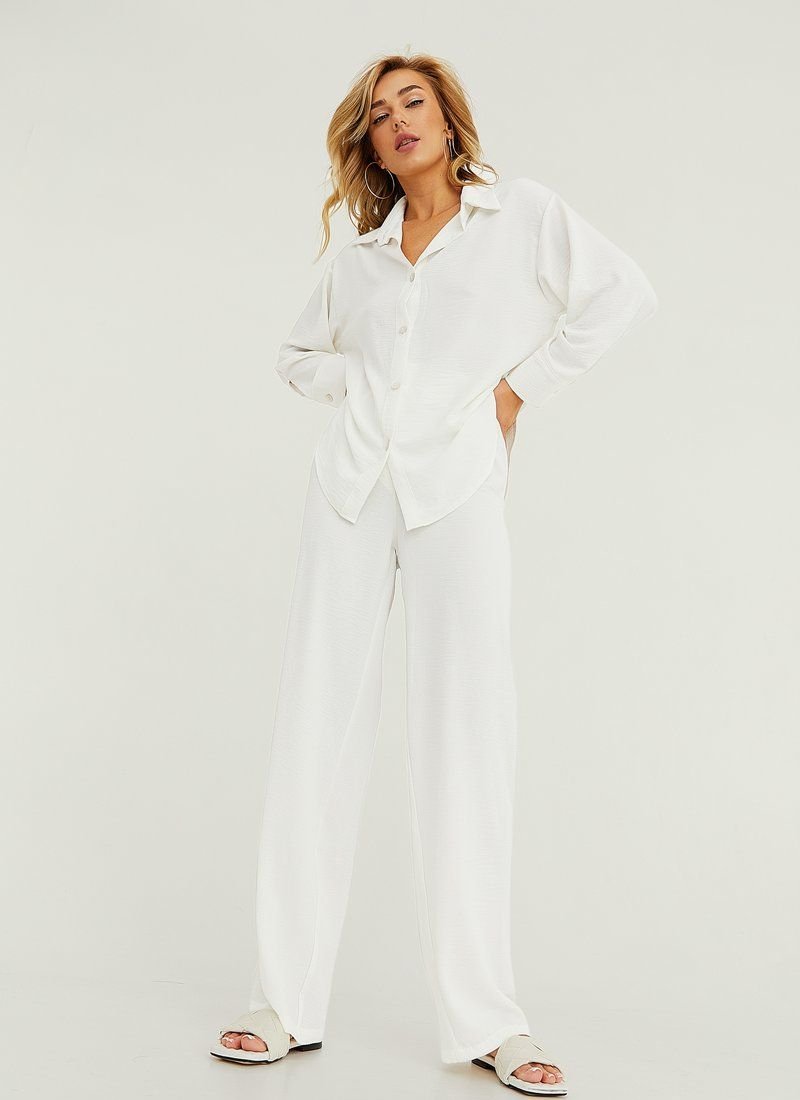 The lightweight, airy material makes the suit an ideal solution for a relaxed look in warm weather. The set consists of a loose shirt with a rounded asymmetrical edge and flared trousers. Elastic waistband provides a comfortable fit.