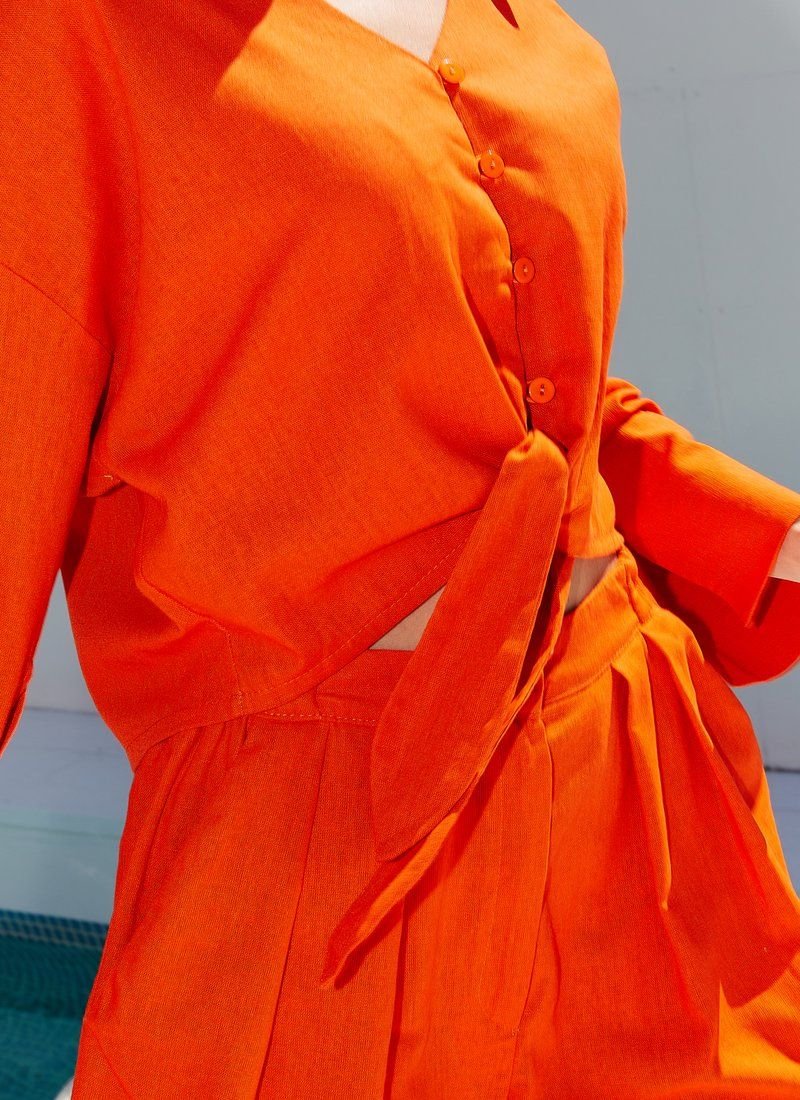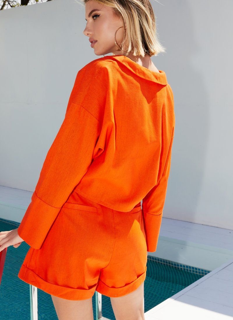 The bright orange shade of the suit will not allow you to go unnoticed. A cropped shirt with a knot and shorts with fixed lapels were sewn from mixed linen, which does not float in hot weather.